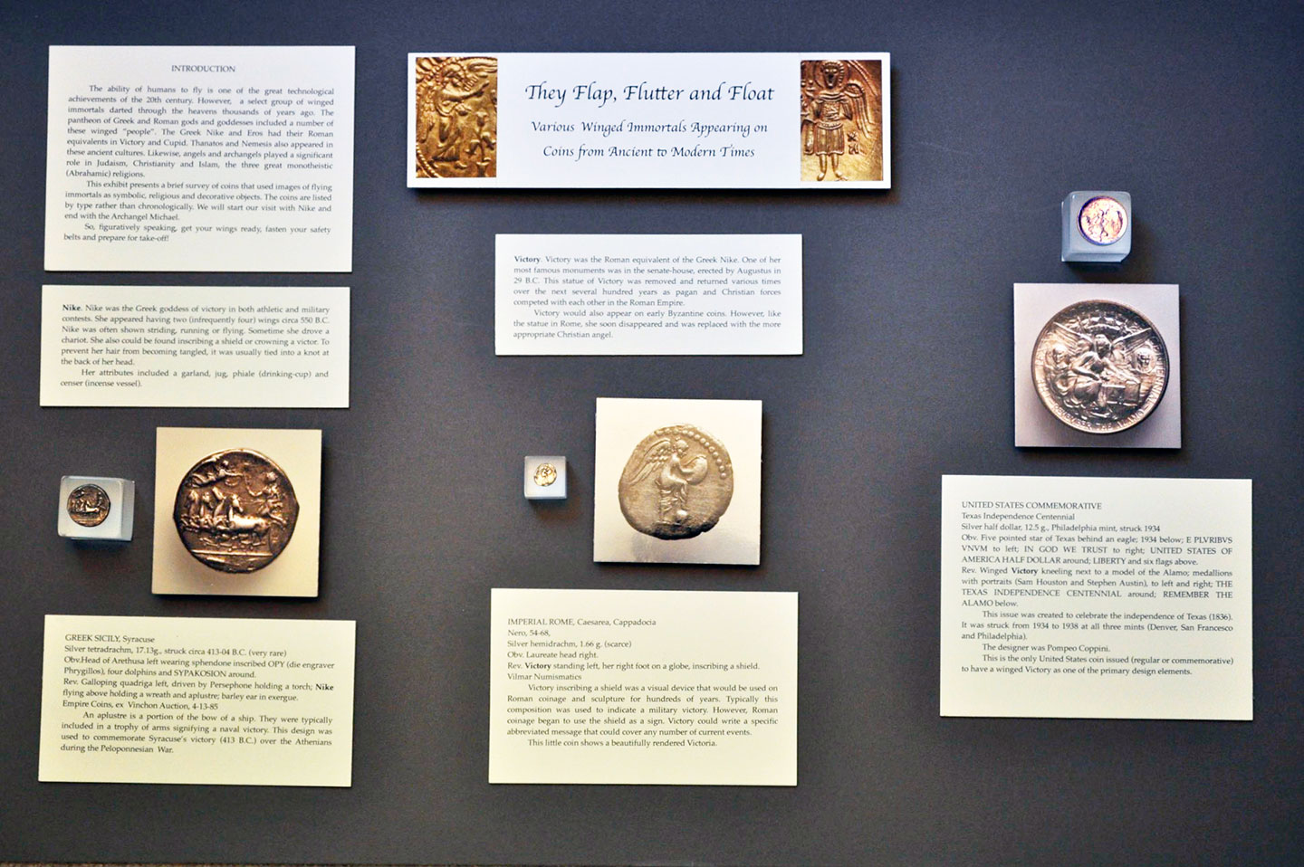 This exhibit presents a brief survey of coins that used images of flying immortals as symbolic, religious and decorative objects. The coins are listed by type rather than chronologically. We will start our visit with Nike and end with the Archangel Michael.