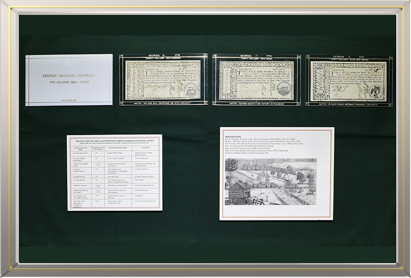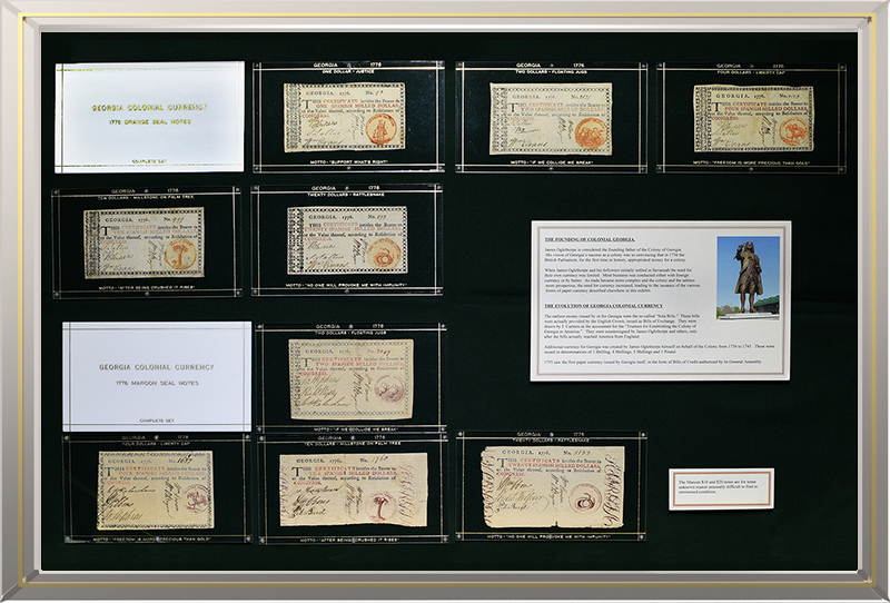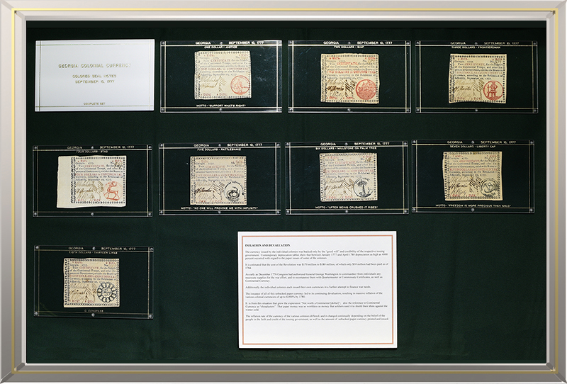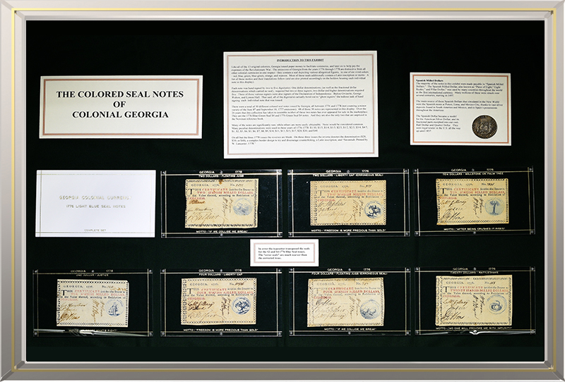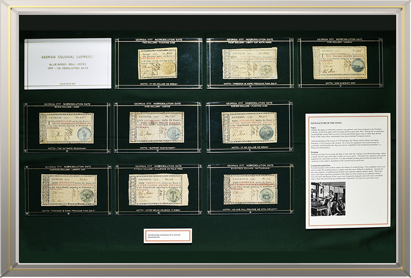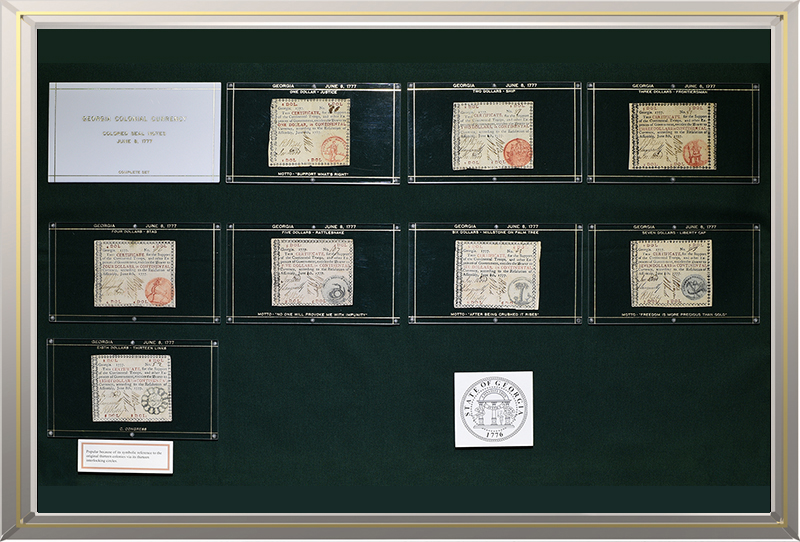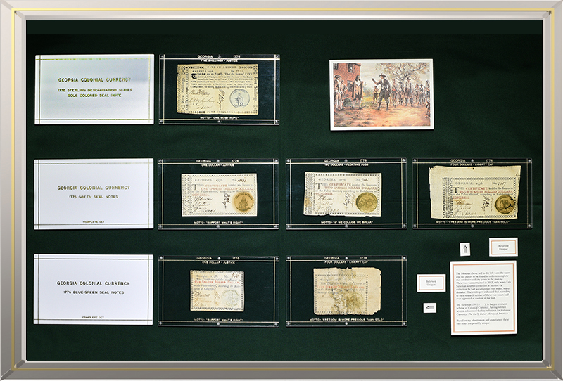 Not counting a minor variety of the June 8 and September 10, 1777 emissions, there were a total of 50 different colored seal notes issued by Georgia, all between 1776 and 1778; all of those 50 notes are represented in this display. In the 30 years that this collection took to assemble, it was not completed until the collection of Eric Newman (the famous numismatist and author of the definitive work on colonial currency) was put up for auction in 2015. The final two notes had never, until then, appeared for sale in the marketplace. They were the 1776 Blue-Green Seal $4 and 1776 Green Seal $4 notes.
