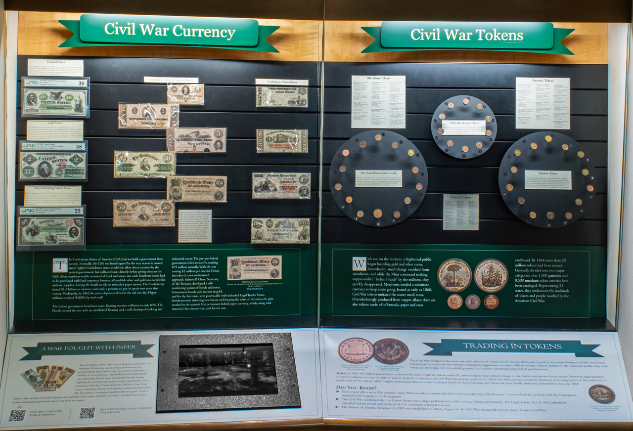 As fighting broke out, gold and silver were hoarded almost immediately, making coinage of any denomination scarce. Merchants needed a substitute currency to keep trade going: tokens, mostly made of copper. By 1864 more than 25 million tokens had been minted. Representing 23 states, they underscore the multitude of places and people touched by the American Civil War. Choose a case below to begin exploring the exhibit.