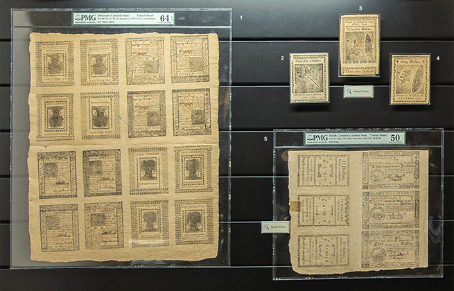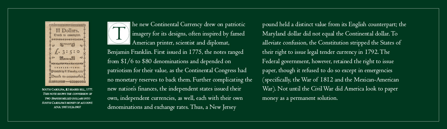 The new Continental Currency drew on patriotic imagery for its designs, often inspired by famed American printer, scientist and diplomat, Benjamin Franklin. First issued in 1775, the notes ranged from $1/6 to $80 denominations and depended on patriotism for their value, as the Continental Congress had no monetary reserves to back them. Further complicating the new nation’s finances, the independent states issued their own, independent currencies, as well, each with their own denominations and exchange rates. Thus, a New Jersey pound held a distinct value from its English counterpart; the Maryland dollar did not equal the Continental dollar. To alleviate confusion, the Constitution stripped the States of their right to issue legal tender currency in 1792. The Federal government, however, retained the right to issue paper, though it refused to do so except in emergencies (specifically, the War of 1812 and the Mexican-American War). Not until the Civil War did America look to paper money as a permanent solution.