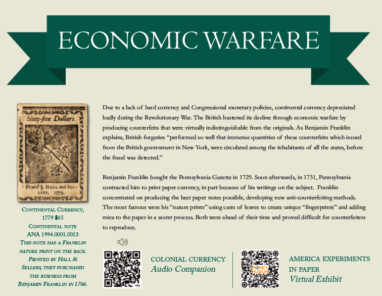 Due to a lack of hard currency and Congressional monetary policies, continental currency depreciated badly during the Revolutionary War. The British hastened its decline through economic warfare by producing counterfeits that were virtually indistinguishable from the originals. As Benjamin Franklin