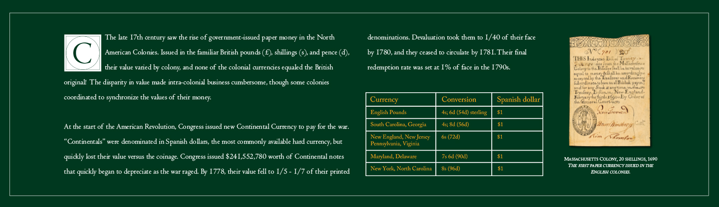 The late 17th century saw the rise of government-issued paper money in the North American Colonies. Issued in the familiar British pounds (£), shillings (s), and pence (d), their value varied by colony, and none of the colonial currencies equaled the British original! The disparity in value made intra-colonial business cumbersome, though some colonies coordinated to synchronize the values of their money.