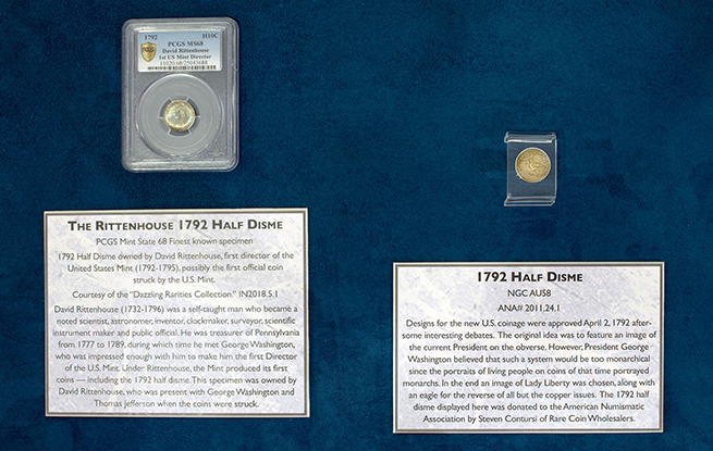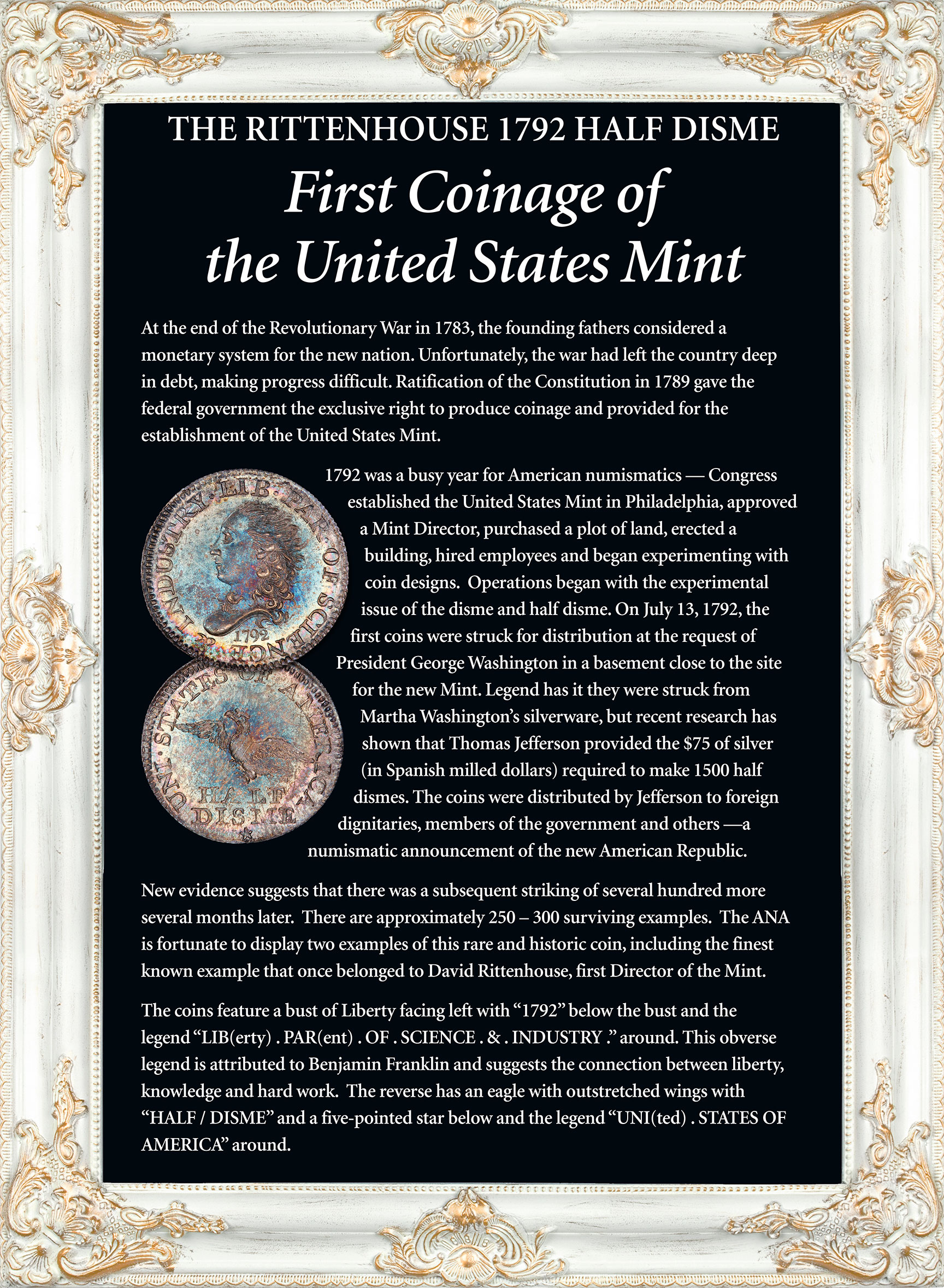 New evidence suggests through die studies that there was a subsequent striking of several hundred more half dismes months later in October, when the new mint buildings were completed and the new striking equipment was being tested. There are approximately 250 – 300 surviving half dismes today. The ANA is fortunate to display two examples of this rare and historic coin, including the finest known example that may once have belonged to David Rittenhouse, first Director of the Mint.