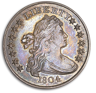 The 1804 silver dollar is among the most coveted of all U.S. rare coins, with only 15 known examples. Strangely, no dollars dated 1804 were actually struck in that year. The United States Mint struck only dollars dated 1803 in 1804, and then ceased regular production of silver dollars until 1840. “1804” dollars were actually struck in 1834-35, when the U.S. Department of State decided to give “complete” type sets of U.S. coins, including the 1804 dollar, as gifts to certain rulers in Asia willing to grant trade concessions to the United States. The appearance in 1962 of the set presented originally to the King of Siam, Rama III, between 1834 and 1836, confirmed this initial purpose.