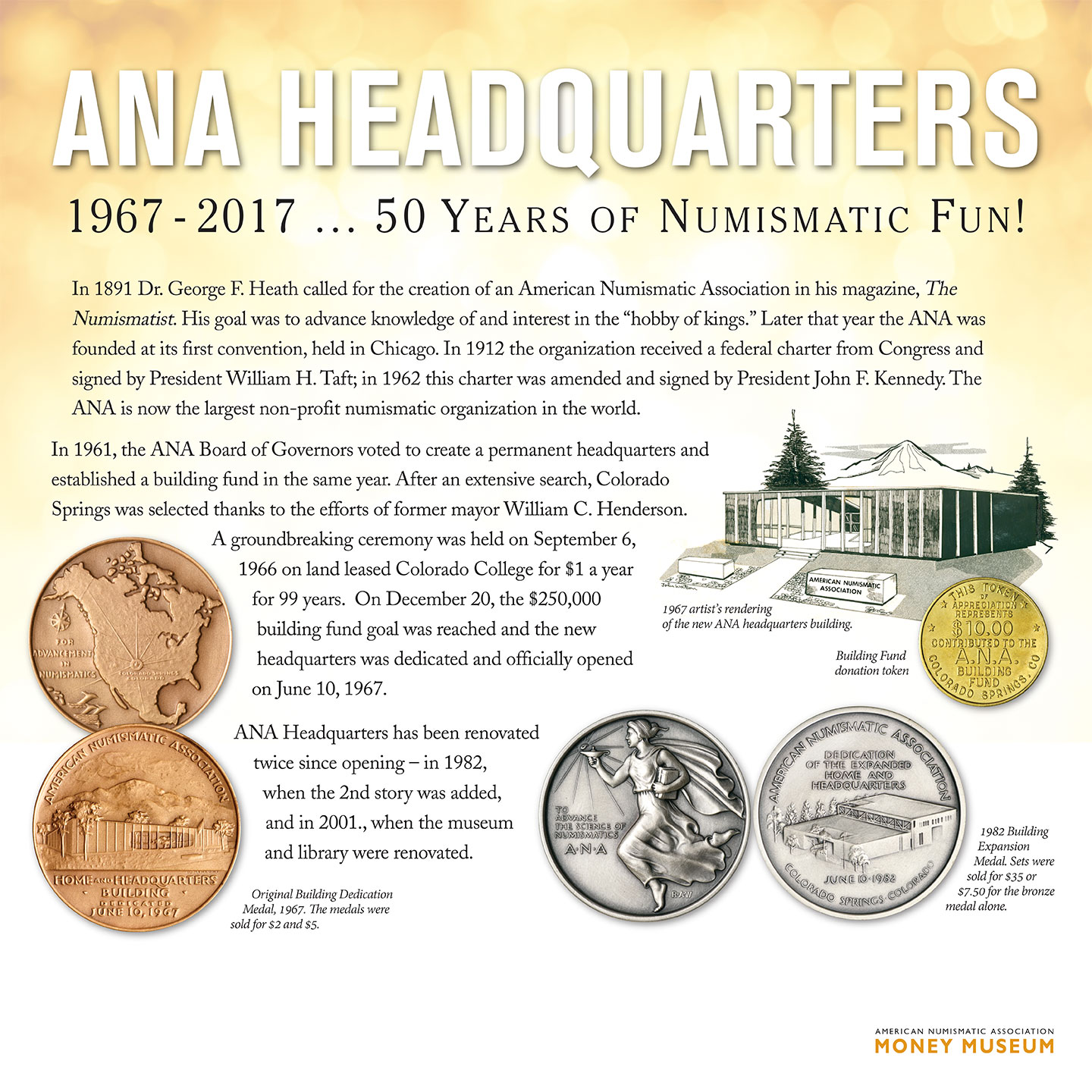 In 1891 Dr. George F. Heath called for the creation of an American Numismatic Association in his magazine, The Numismatist. His goal was to advance knowledge of and interest in the “hobby of kings.” Later that year the ANA was founded at its first convention, held in Chicago. In 1912 the organization received a federal charter from Congress and signed by President William H. Taft; in 1962 this charter was amended and signed by President John F. Kennedy. The ANA is now the largest non-profit numismatic organization in the world.