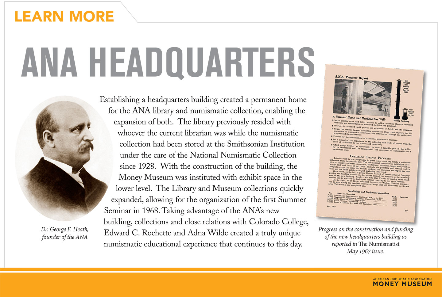 In 1961, the ANA Board of Governors voted to create a permanent headquarters and established a building fund in the same year. After an extensive search, Colorado Springs was selected thanks to the efforts of former mayor William C. Henderson. A groundbreaking ceremony was held on September 6, 1966 on land leased from Colorado College for $1 a year for 99 years. On December 20, the $250,000 building fund goal was reached and the new headquarters was dedicated and officially opened on June 10, 1967.