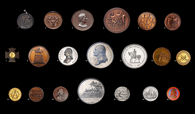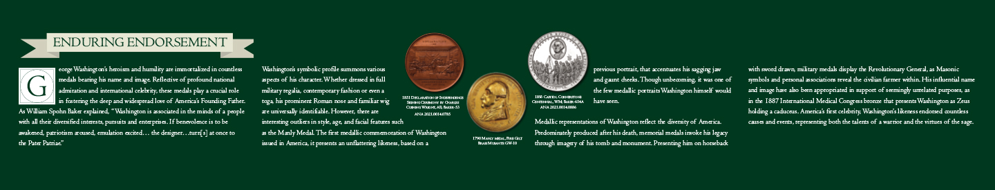 Medallic representations of Washington reflect the diversity of America. Predominately produced after his death, memorial medals invoke his legacy through imagery of his tomb and monument. Presenting him on horseback with sword drawn, military medals display the Revolutionary General, as Masonic symbols and personal associations reveal the civilian farmer within. His influential name and image have also been appropriated in support of seemingly unrelated purposes, as in the 1887 International Medical Congress bronze that presents Washington as Zeus holding a caduceus. America’s first celebrity, Washington’s likeness endorsed countless causes and events, representing both the talents of a warrior and the virtues of the sage.