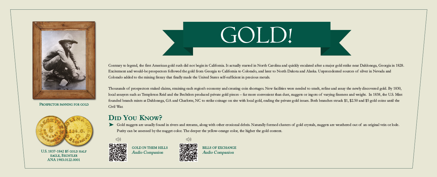 Thousands of prospectors staked claims, straining each region’s economy and creating coin shortages. New facilities were needed to smelt, refine and assay the newly discovered gold. By 1830, local assayers such as Templeton Reid and the Bechtlers produced private gold pieces – far more convenient than dust, nuggets or ingots of varying fineness and weight. In 1838, the U.S. Mint founded branch mints at Dahlonega, GA and Charlotte, NC to strike coinage on site with local gold, ending the private gold issues. Both branches struck $1, $2.50 and $5 gold coins until the Civil War.