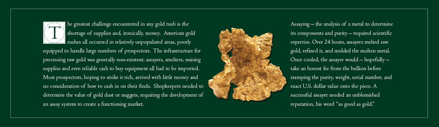 Assaying – the analysis of a metal to determine its components and purity – required scientific expertise. Over 24 hours, assayers melted raw gold, refined it, and molded the molten metal. Once cooled, the assayer would – hopefully – take an honest fee from the bullion before stamping the purity, weight, serial number, and exact U.S. dollar value onto the piece. A successful assayer needed an unblemished reputation, his word “as good as gold.”