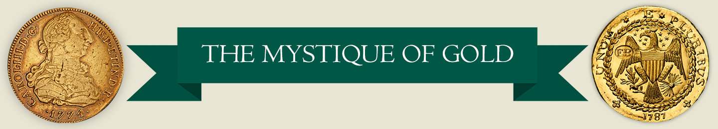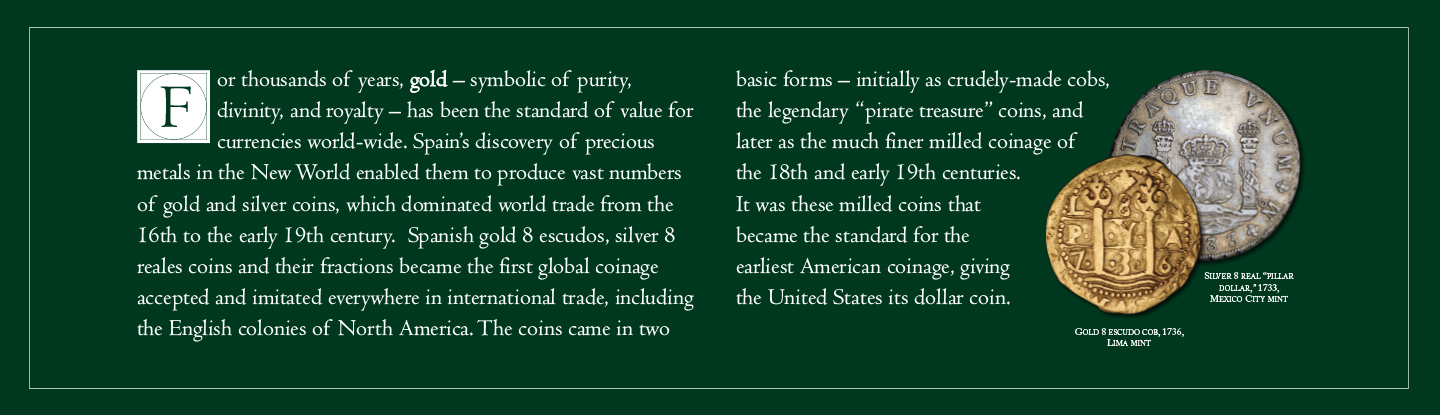 For thousands of years, gold – symbolic of purity, divinity, and royalty – has been the standard of value for currencies world-wide. Spain’s discovery of precious metals in the New World enabled them to produce vast numbers of gold and silver coins, which dominated world trade from the 16th to the early 19th century. Spanish gold 8 escudos, silver 8 reales coins and their fractions became the first global coinage accepted and imitated everywhere in international trade, including the English colonies of North America. The coins came in two basic forms – initially as crudely-made cobs, the legendary “pirate treasure” coins, and later as the much finer milled coinage of the 18th and early 19th centuries. It was these milled coins that became the standard for the earliest American coinage, giving the United States its dollar coin.
