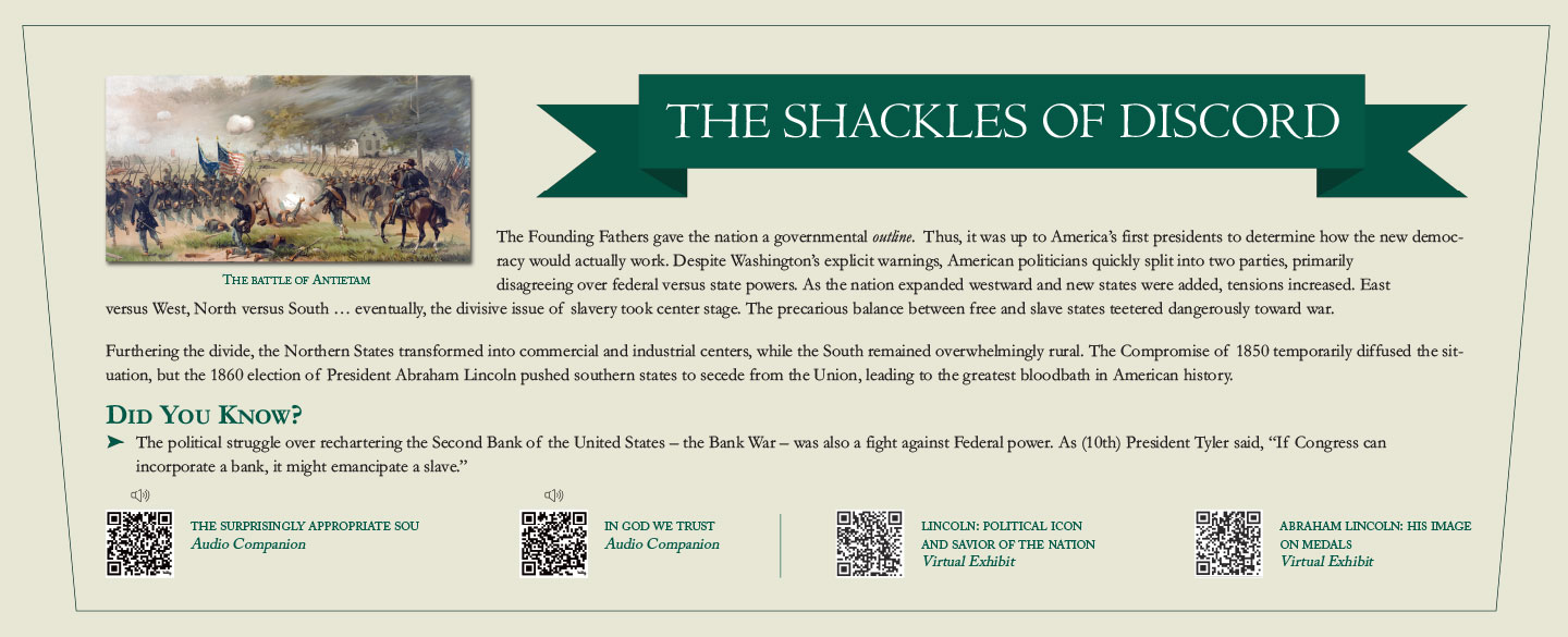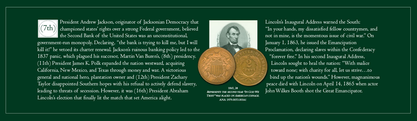 (7th) President Andrew Jackson, originator of Jacksonian Democracy that championed states’ rights over a strong Federal government, believed the Second Bank of the United States was an unconstitutional, government-run monopoly. Declaring, “the bank is trying to kill me, but I will kill it!” he vetoed its charter renewal. Jackson’s ruinous banking policy led to the 1837 panic, which plagued his successor, Martin Van Buren’s, (8th) presidency. (11th) President James K. Polk expanded the nation westward, acquiring California, New Mexico, and Texas through money and war. A victorious general and national hero, plantation owner and (12th) President Zachary Taylor disappointed Southern hopes with his refusal to actively defend slavery, leading to threats of secession. However, it was (16th) President Abraham Lincoln’s election that finally lit the match that set America alight.