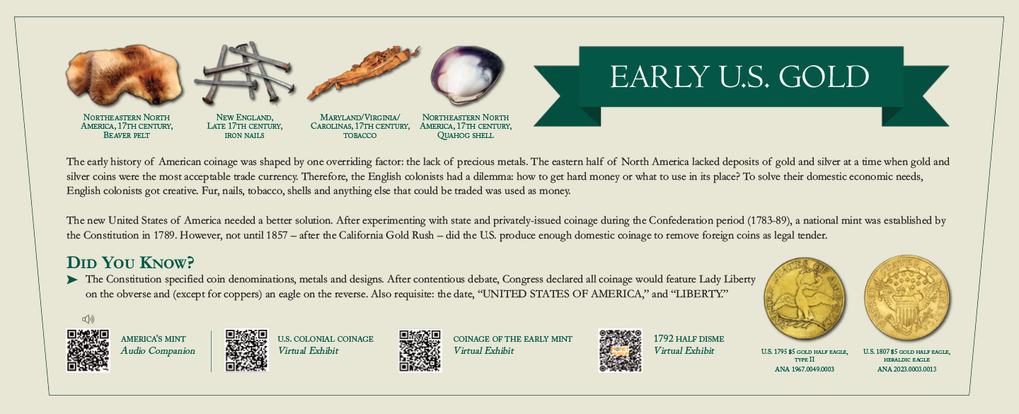 The new United States of America needed a better solution. After experimenting with state and privately-issued coinage during the Confederation period (1783-89), a national mint was established by the Constitution in 1789. However, not until 1857 – after the California Gold Rush – did the U.S. produce enough domestic coinage to remove foreign coins as legal tender.