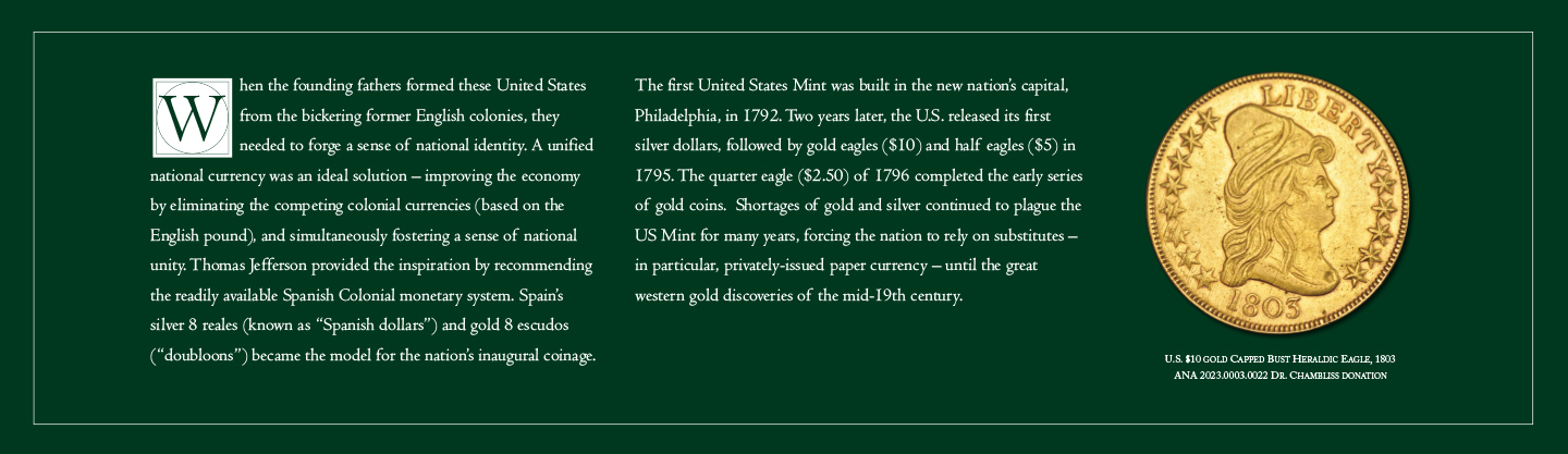 The first United States Mint was built in the new nation’s capital, Philadelphia, in 1792. Two years later, the U.S. released its first silver dollars, followed by gold eagles ($10) and half eagles ($5) in 1795. The quarter eagle ($2.50) of 1796 completed the early series of gold coins. Shortages of gold and silver continued to plague the US Mint for many years, forcing the nation to rely on substitutes – in particular, privately-issued paper currency – until the great