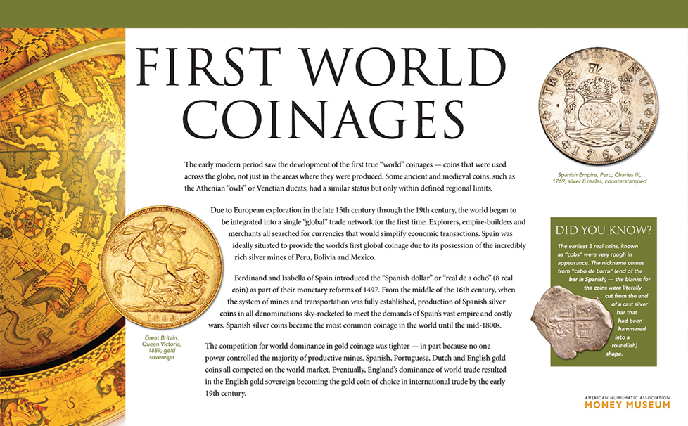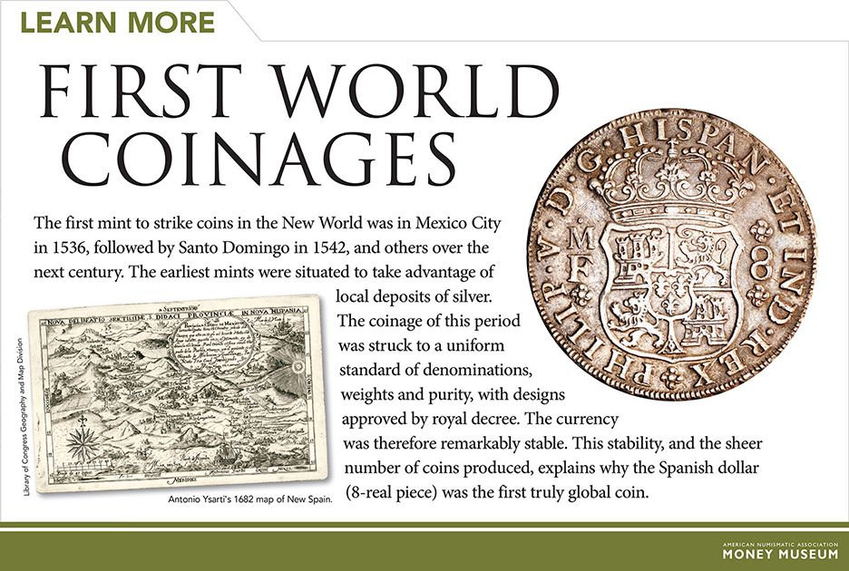 Due to European exploration in the late 15th century through the 19th century, the world began to be integrated into a single “global” trade network for the first time. Explorers, empire-builders and merchants all searched for currencies that would simplify economic transactions. Spain was ideally situated to provide the world’s first global coinage due to its possession of the incredibly rich silver mines of Peru, Bolivia and Mexico.