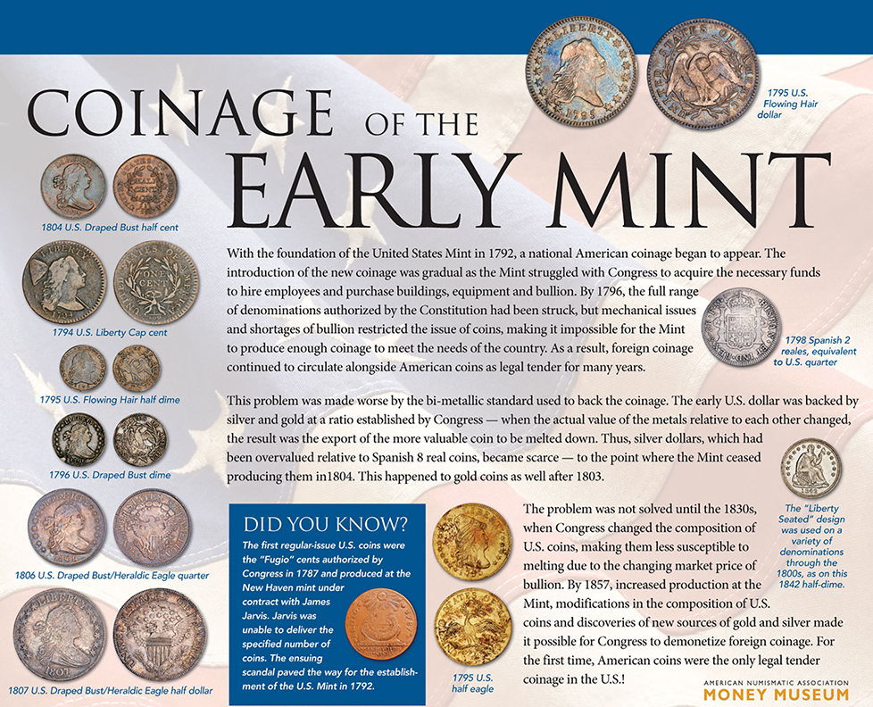 The first regular-issue U.S. coins were the “Fugio” cents authorized by Congress in 1787 and produced at the New Haven mint under contract with James Jarvis. Jarvis was unable to deliver the specified number of coins. The ensuing scandal paved the way for the establishment of the U.S. Mint in 1792.