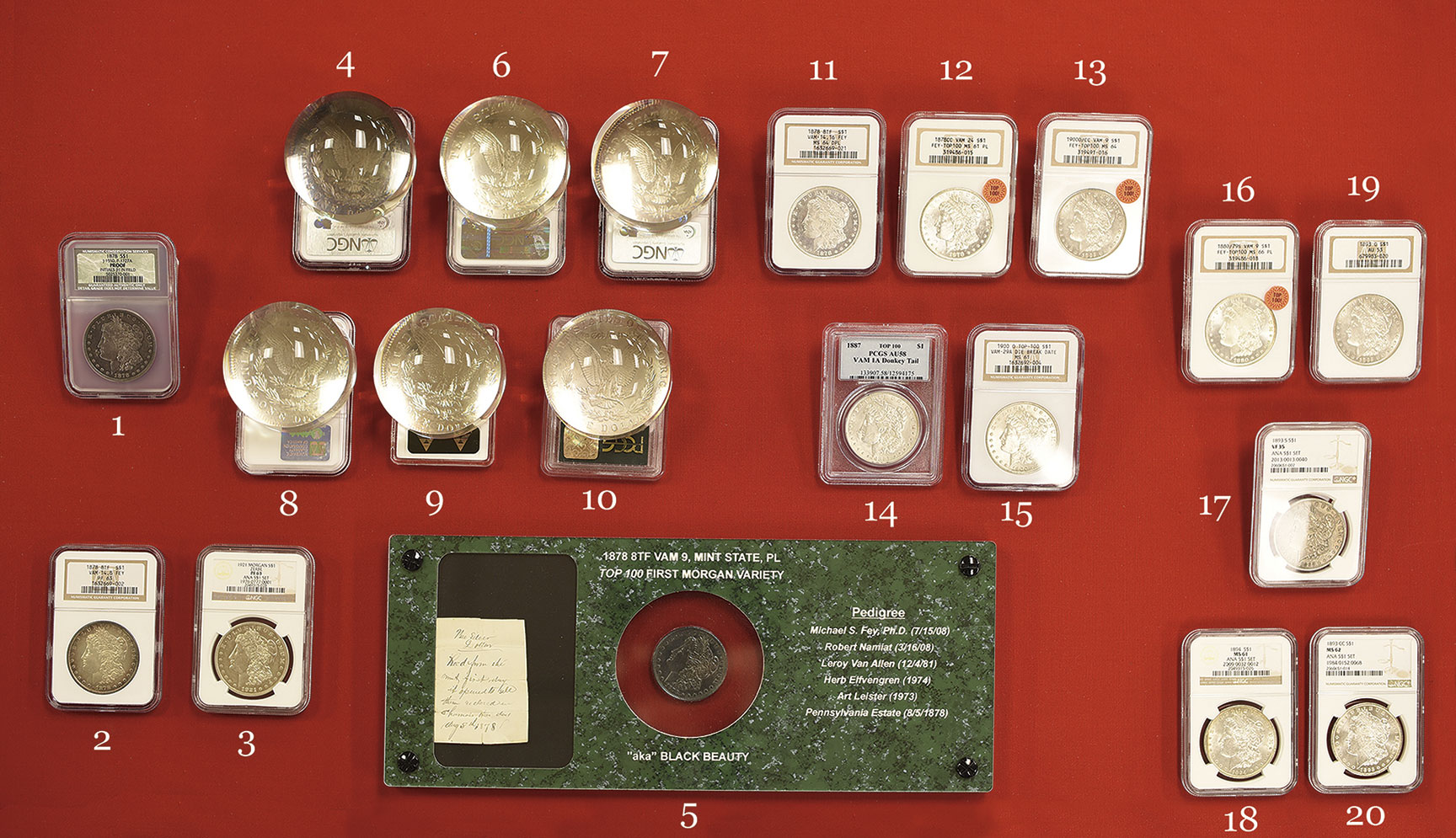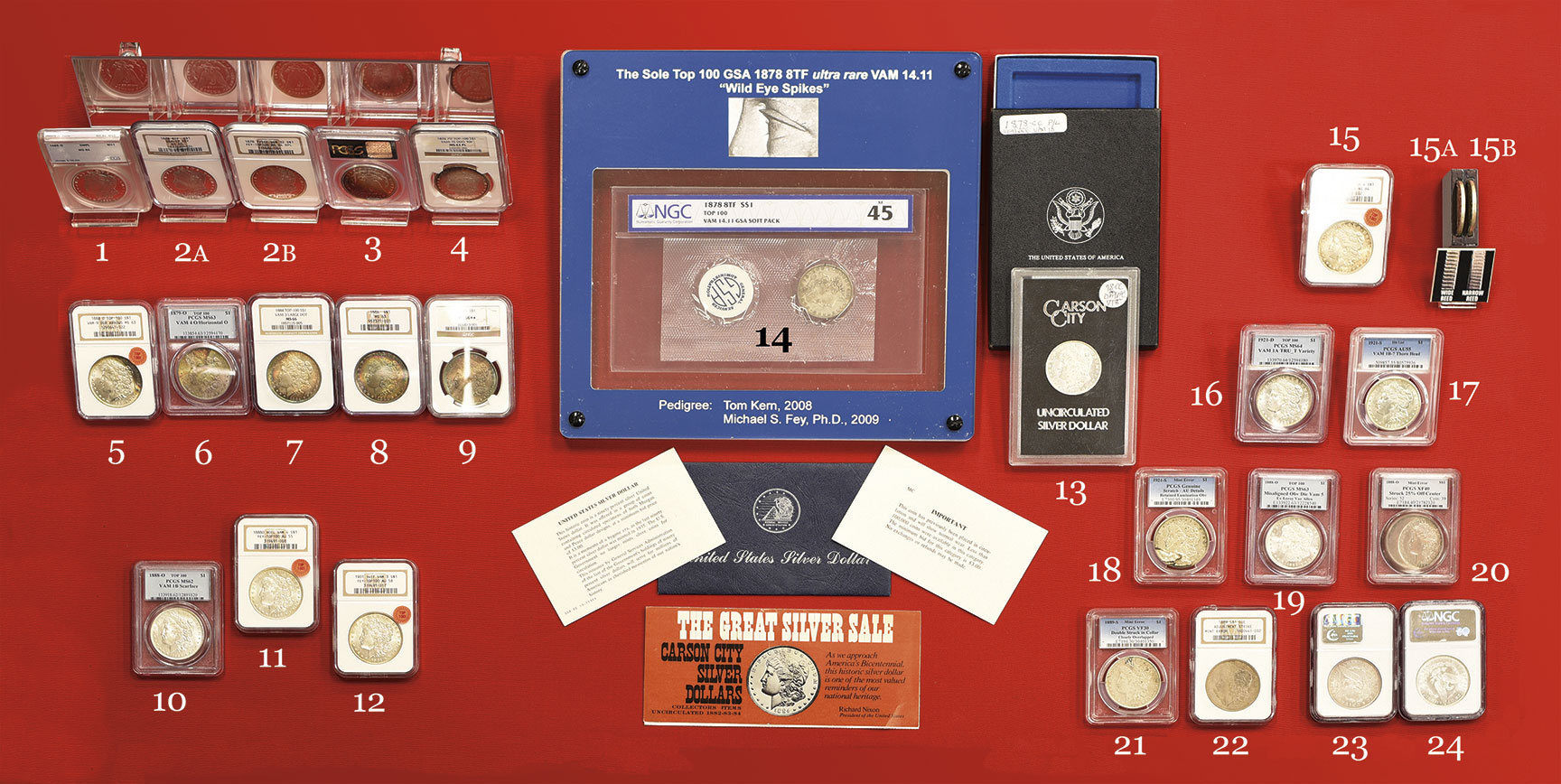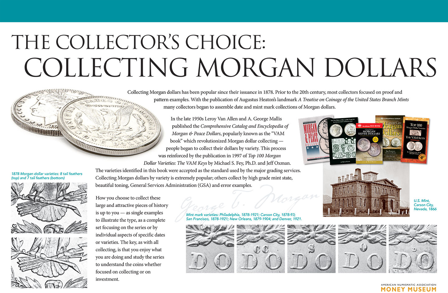 In the late 1950s Leroy Van Allen and A. George Mallis published the Comprehensive Catalog and Encyclopedia of Morgan & Peace Dollars, popularly known as the “VAM book” which revolutionized Morgan dollar collecting – people began to collect their dollars by variety. This process was reinforced by the publication in 1997 of Top 100 Morgan Dollar Varieties: The VAM Keys by Michael S. Fey, Ph.D. and Jeff Oxman. The varieties identified in this book were accepted as the standard used by the major grading services. Collecting Morgan dollars by variety is extremely popular; others collect by high grade mint state, beautiful toning, General Services Administration (GSA) and error examples.