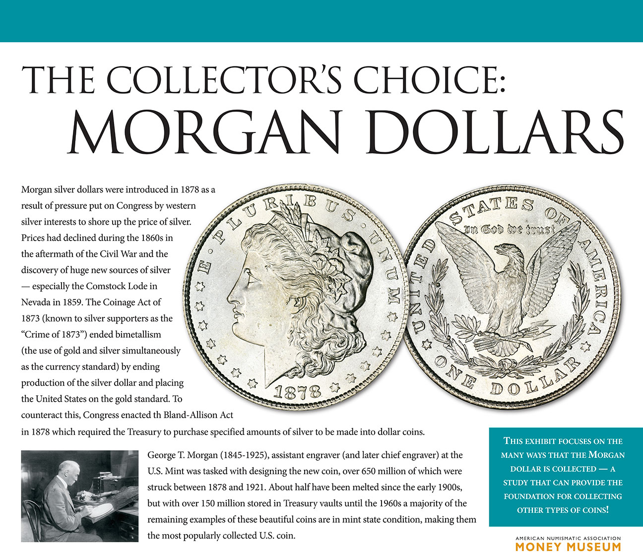 George T. Morgan (1845-1925), assistant engraver (and later chief engraver) at the U.S. Mint was tasked with designing the new coin, over 650 million of which were struck between 1878 and 1921. About half have been melted since the early 1900s, but with over 150 million stored in Treasury vaults until the 1960s a majority of the remaining examples of these beautiful cons are in mint state condition, making them the most popularly collected U.S. coin.