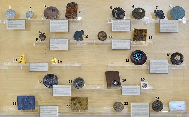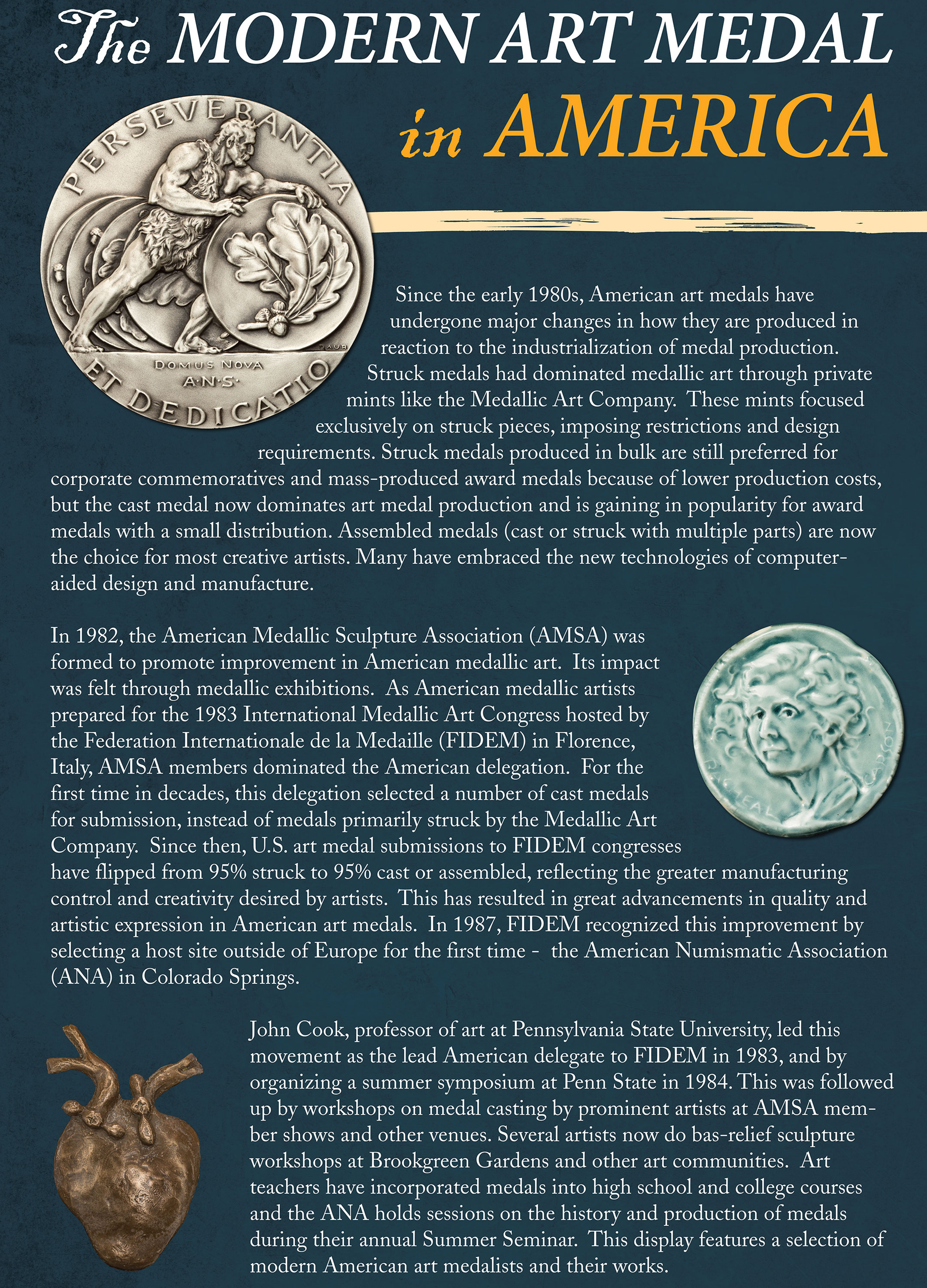 John Cook, professor of art at Pennsylvania State University, led this movement as the lead American delegate to FIDEM in 1983, and by organizing a summer symposium at Penn State in 1984. This was followed up by workshops on medal casting by prominent artists at AMSA member shows and other venues. Several artists now do bas-relief sculpture workshops at Brookgreen Gardens and other art communities. Art teachers have incorporated medals into high school and college courses and the ANA holds sessions on the history and production of medals during their annual Summer Seminar. This display features a selection of modern American art medalists and their works.