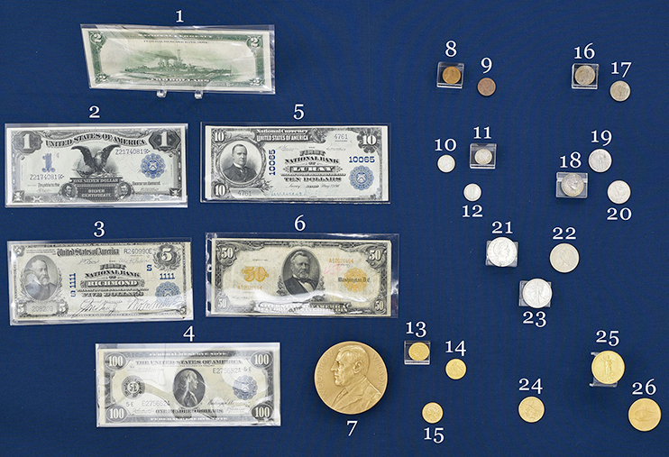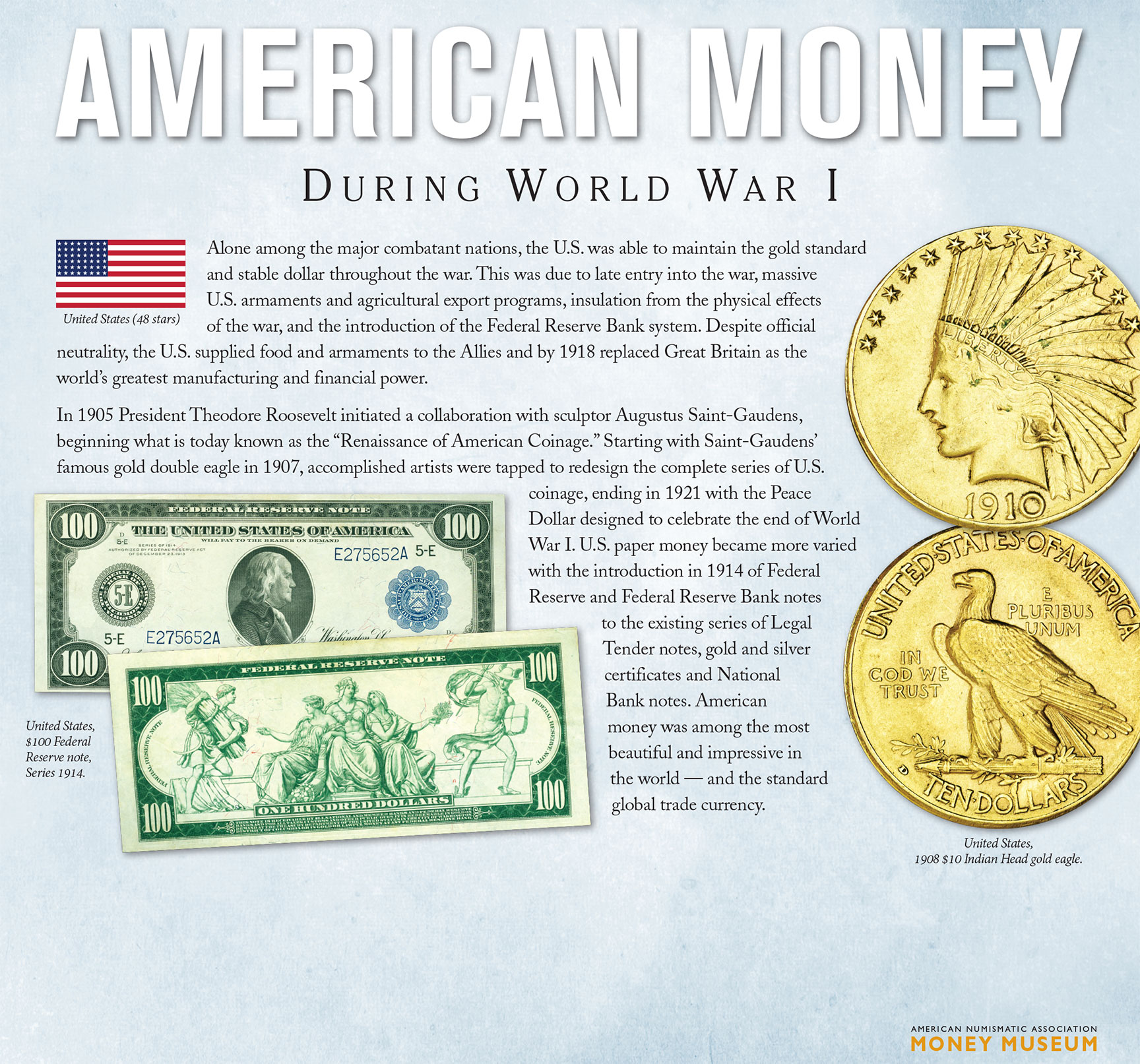 In 1905 President Theodore Roosevelt initiated a collaboration with sculptor Augustus Saint-Gaudens, beginning what is today known as the “Renaissance of American Coinage.” Starting with Saint-Gaudens’ famous gold double eagle in 1907, accomplished artists were tapped to redesign the complete series of U.S. coinage, ending in 1921 with the Peace Dollar designed to celebrate the end of World War I. U.S. paper money became more varied with the introduction in 1914 of Federal Reserve and Federal Reserve Bank notes to the existing series of Legal Tender notes, gold and silver certificates and National Bank notes. American money was among the most beautiful and impressive in the world — and the standard global trade currency.