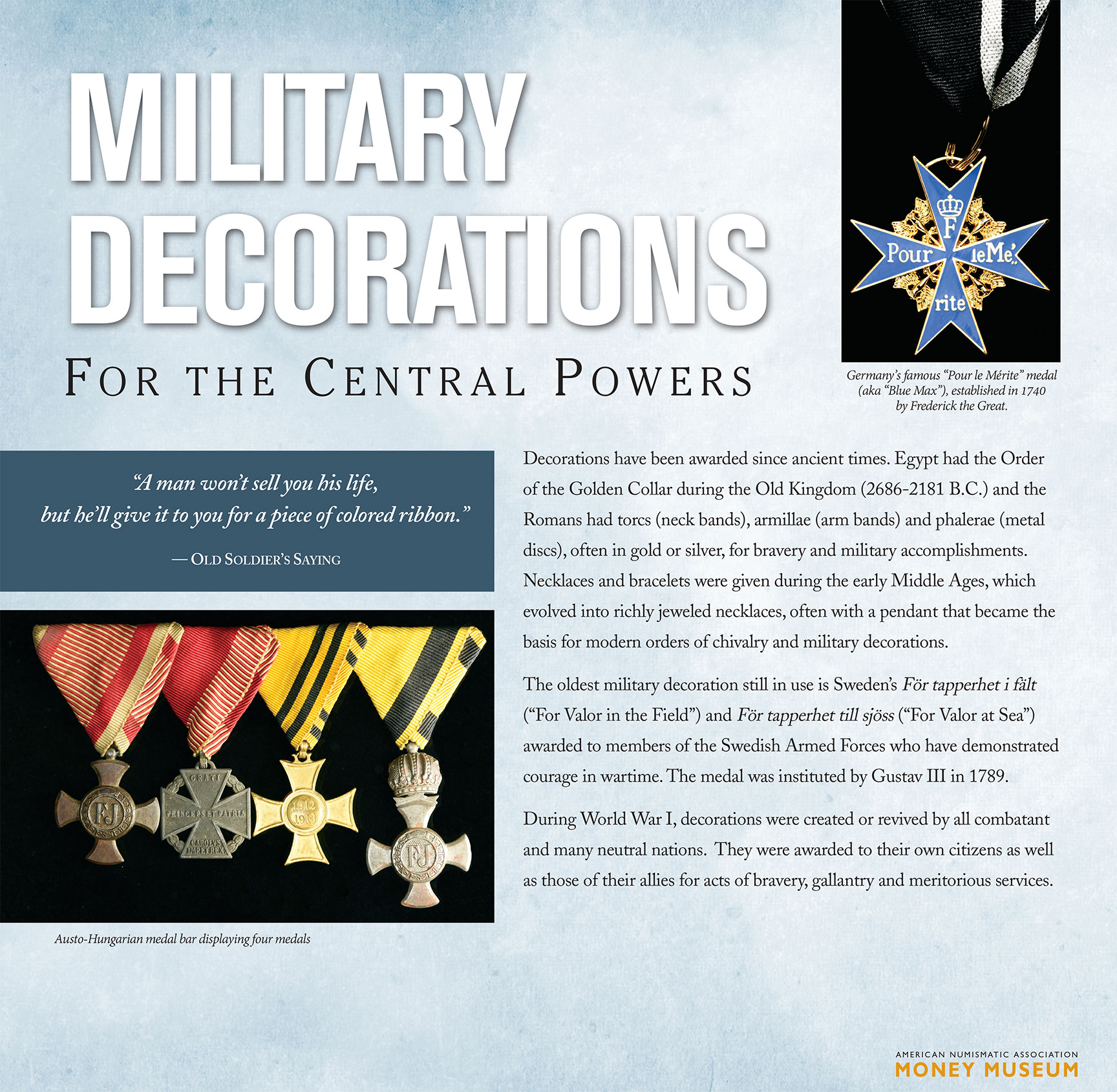 Decorations have been awarded since ancient times. Egypt had the Order of the Golden Collar during the Old Kingdom (2686-2181 B.C.) and the Romans had torcs (neck bands), armillae (arm bands) and phalerae (metal discs), often in gold or silver, for bravery and military accomplishments.