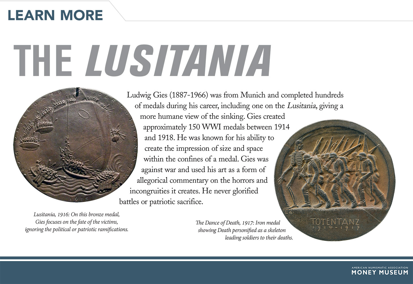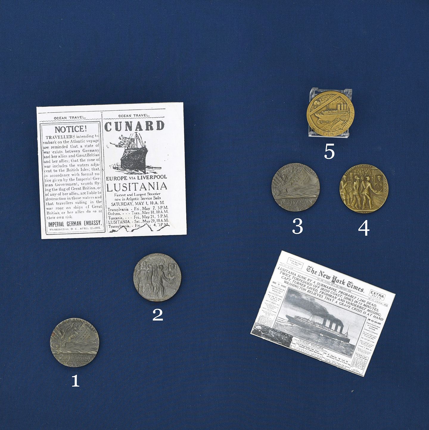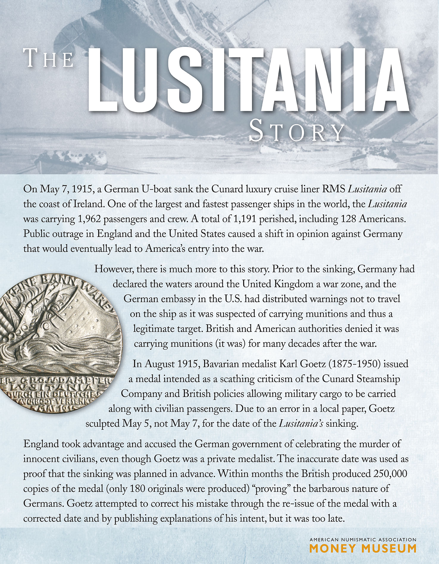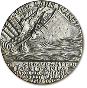 In August 1915, Bavarian medalist Karl Goetz (1875-1950) issued a medal intended as a scathing criticism of the Cunard Steamship Company and British policies allowing military cargo to be carried along with civilian passengers. Due to an error in a local paper, Goetz sculpted May 5, not May 7, for the date of the Lusitania’s sinking.