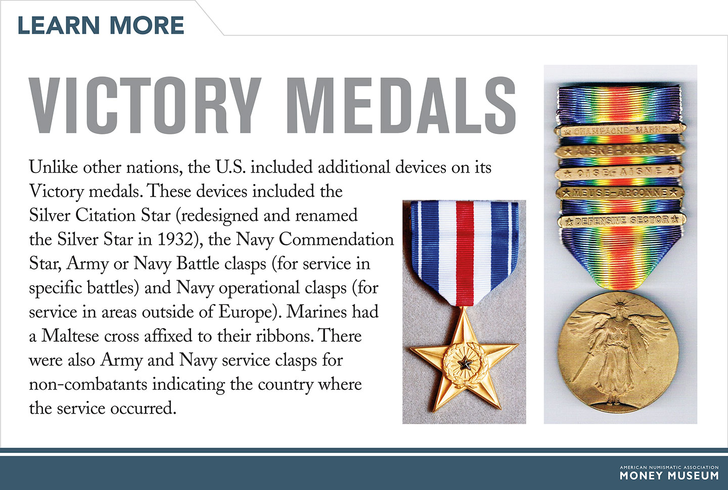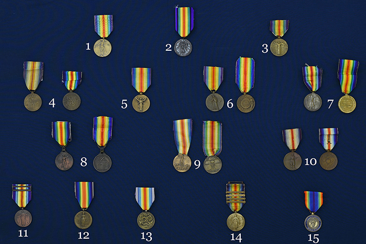 Criteria for issuing the medals were different for each country — some only included combatants, while others included anyone involved. The American medal was designed by James Earle Fraser and was authorized in 1919. Its reverse had “The Great War For Civilization” inscribed across the top and a list of the Allied nations on either side of an American shield with a fasces over it (symbolizing peace) and six stars below. Since Congress didn’t fund the medals, they were issued by the Army and Navy departments through general orders and were issued to all servicemen who served between April 6, 1917 and November 11, 1918 and those that served in European Russia or Siberia between November 11, 1918 and April 1, 1920.