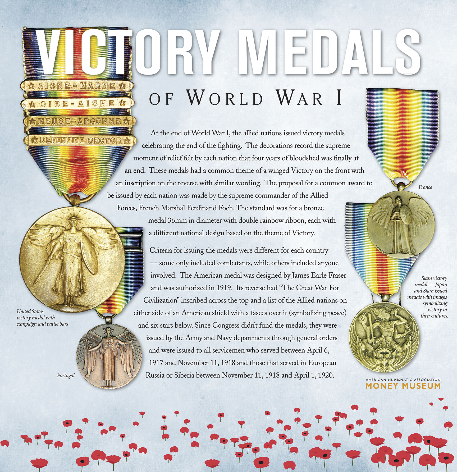 At the end of World War I, the allied nations issued victory medals celebrating the end of the fighting. The decorations record the supreme moment of relief felt by each nation that four years of bloodshed was finally at an end.