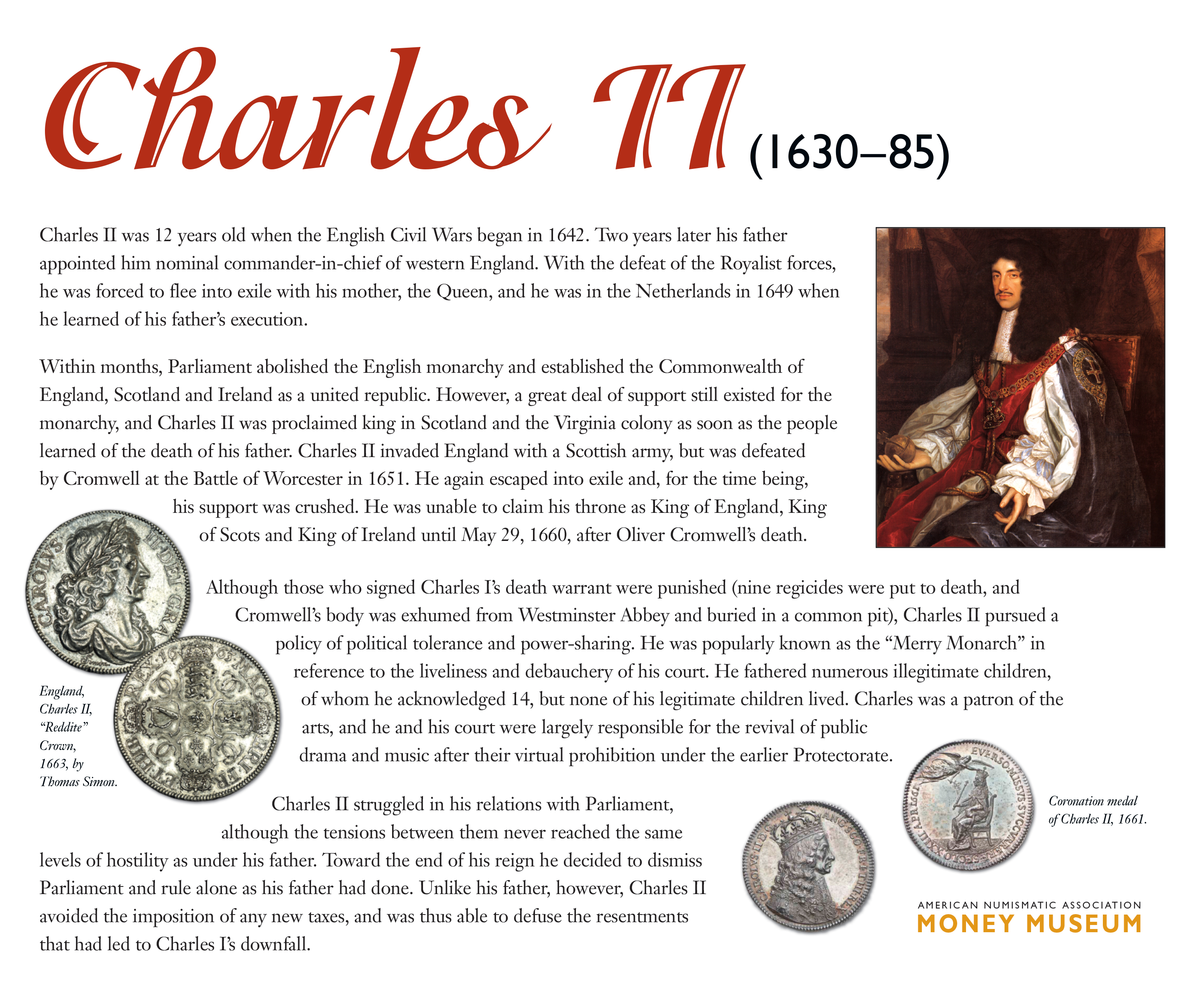 Charles II struggled in his relations with Parliament, although the tensions between them never reached the same levels of hostility as under his father. Toward the end of his reign he decided to dismiss Parliament and rule alone as his father had done. Unlike his father, however, Charles II avoided the imposition of any new taxes, and was thus able to defuse the resentments that had led to Charles I’s downfall.