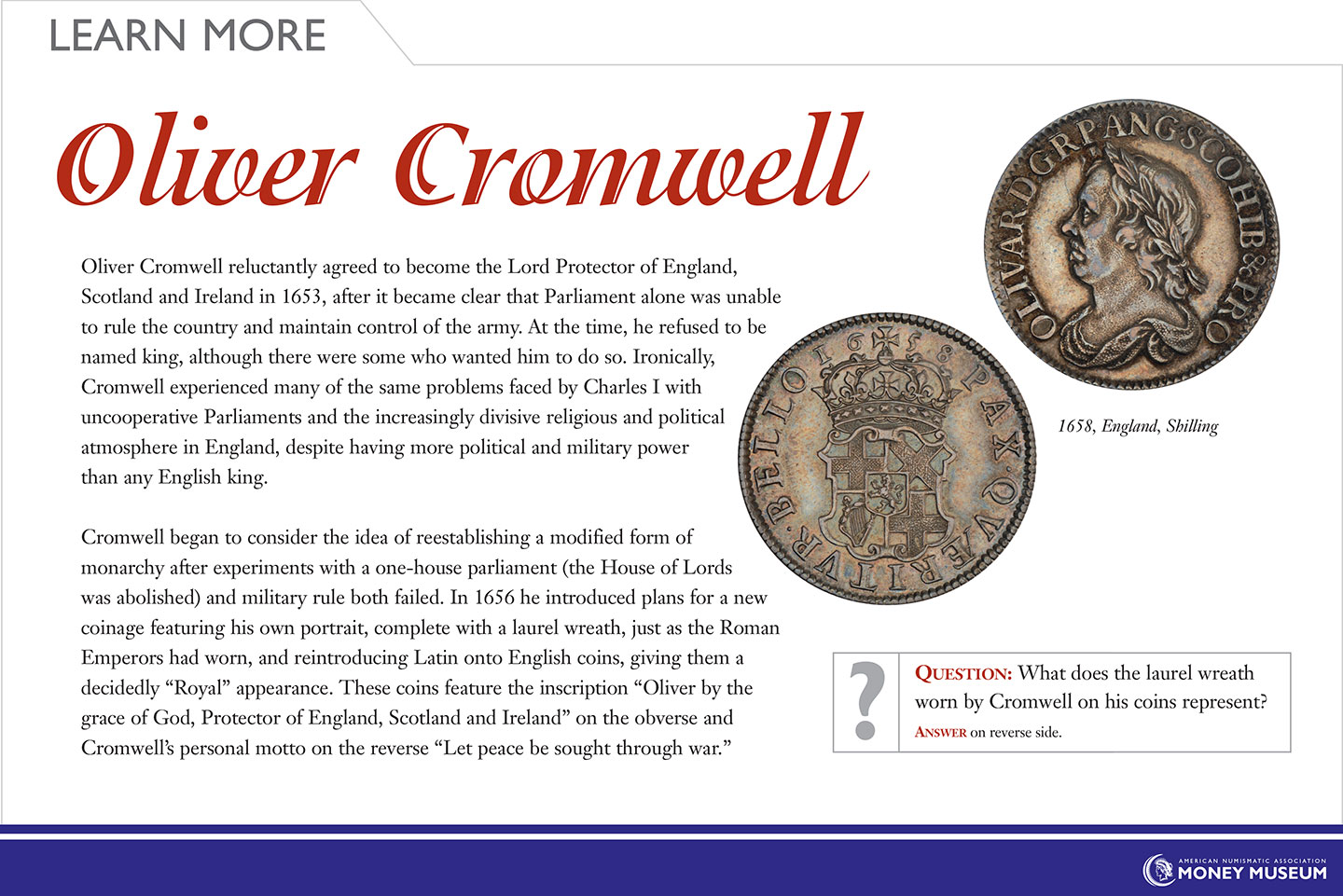 In December 1653, Cromwell became Lord Protector (the title of king was suggested, but he rejected it), an office he held under a written constitution that specified a government made up of the Lord Protector, Parliament and a council. As Lord Protector, Cromwell became a virtual dictator. He experimented with various ways to rule the Commonwealth, starting with a Protectorate Parliament (without a House of Lords) and then an unpopular military government, which he replaced with personal rule (much as Charles I had done). He sought to restore order and stability at home and to promote English and Protestant interests in foreign policy. Oliver Cromwell died on September 3, 1658, naming his son Richard as successor. With Cromwell’s death, the Commonwealth foundered and the monarchy was restored two years later.