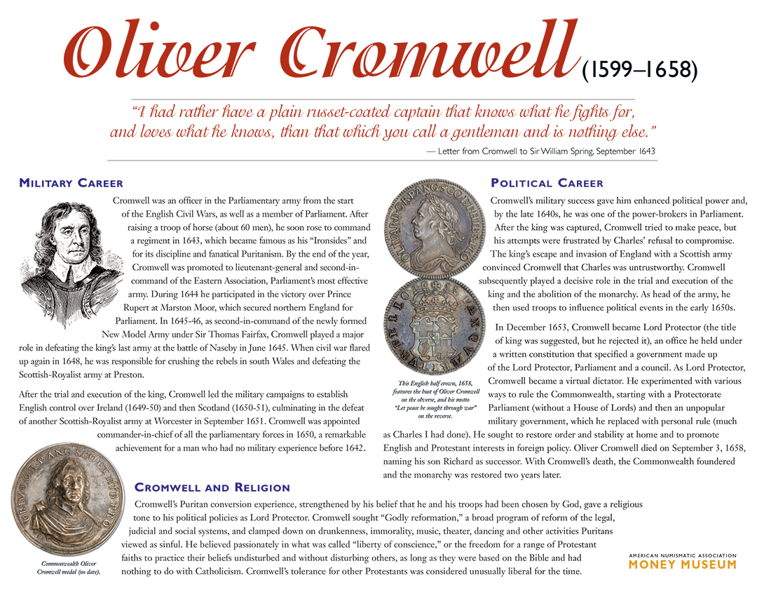 Cromwell was an officer in the Parliamentary army from the start of the English Civil Wars, as well as a member of Parliament. After raising a troop of horse (about 60 men), he soon rose to command a regiment in 1643, which became famous as his “Ironsides” and for its discipline and fanatical Puritanism. By the end of the year, Cromwell was promoted to lieutenant-general and second-in-command of the Eastern Association, Parliament’s most effective army. During 1644 he participated in the victory over Prince Rupert at Marston Moor, which secured northern England for Parliament. In 1645-46, as second-in-command of the newly formed New Model Army under Sir Thomas Fairfax, Cromwell played a major role in defeating the king’s last army at the battle of Naseby in June 1645. When civil war flared up again in 1648, he was responsible for crushing the rebels in south Wales and defeating the Scottish-Royalist army at Preston.