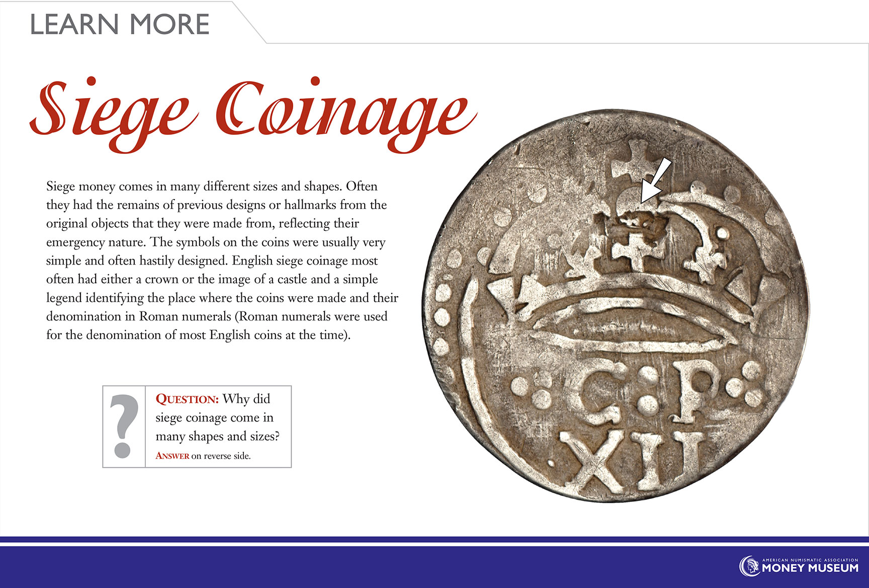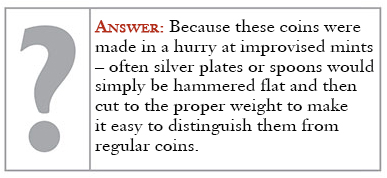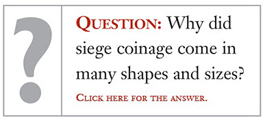 Siege money was produced to pay defending troops when normal money ran out. Soldiers had to be paid to maintain their willingness to fight, and to prevent them from stealing from civilians. Payment had to be made with whatever gold or silver coinage was collected. When that was gone, the townspeople’s gold or silver jewelry and silverware was converted into emergency coinage. This was done by flattening and then cutting the metal into pieces of the correct weight and then stamping them with a crude design. Siege money was generally made to the same standards as regular coinage and was intended to be redeemed after the siege in legal tender. Of course, if the defenders were unsuccessful, silver or gold could be melted down for their bullion value.