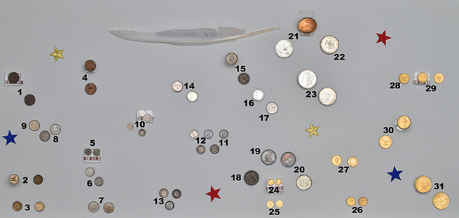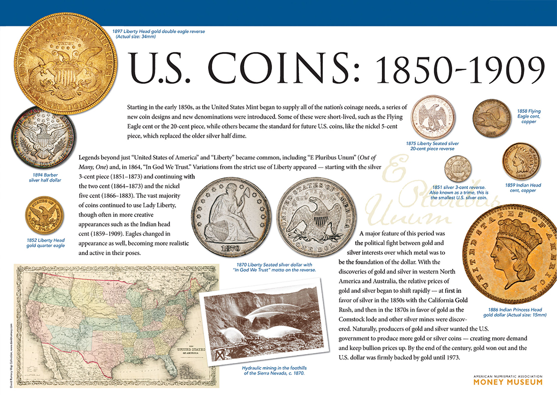 Legends beyond just “United States of America” and “Liberty” became common, including “E Pluribus Unum” (Out of Many, One) and, in 1864, “In God We Trust.” Variations from the strict use of Liberty appeared — starting with the silver 3-cent piece (1851–1873) and continuing with the two cent (1864–1873) and the nickel five cent (1866–1883). The vast majority of coins continued to use Lady Liberty, though often in more creative appearances such as the Indian head cent (1859–1909). Eagles changed in appearance as well, becoming more realistic and active in their poses.
