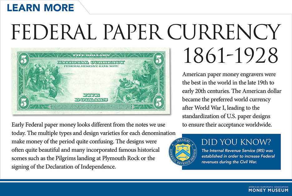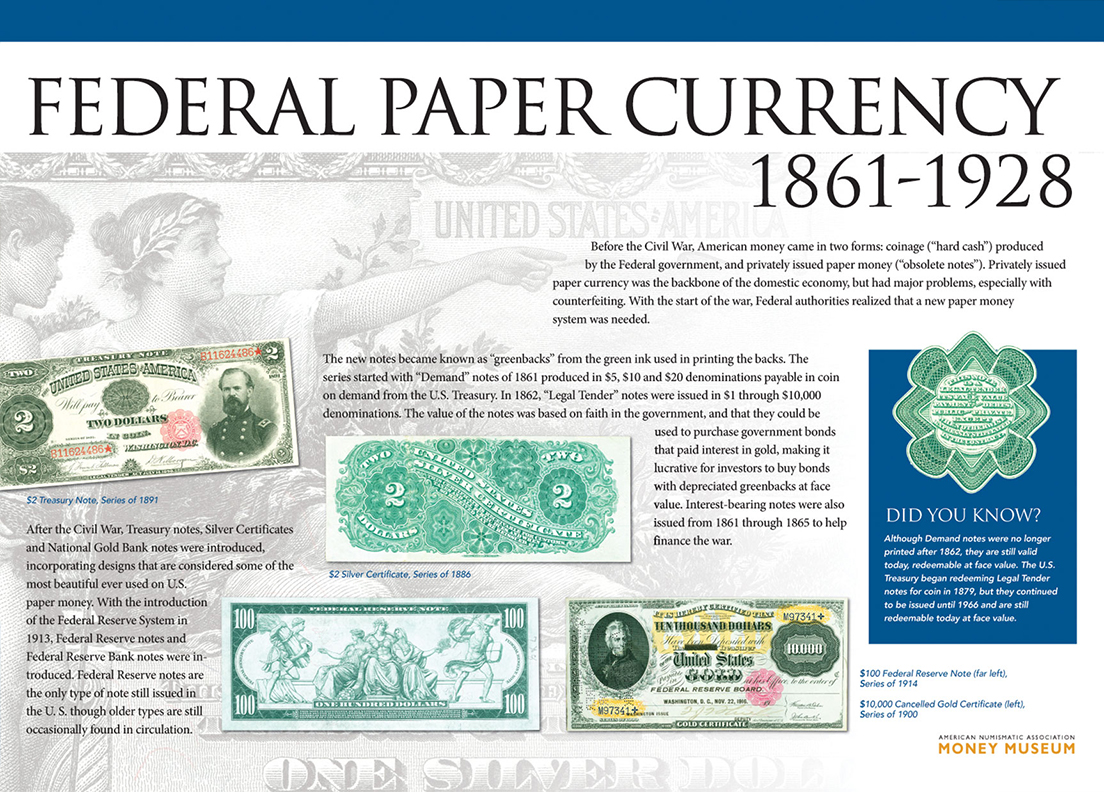 The new notes became known as “greenbacks” from the green ink used in printing the backs. The series started with “Demand” notes of 1861 produced in $5, $10 and $20 denominations payable in coin on demand from the U.S. Treasury. In 1862, “Legal Tender” notes were issued in $1 through $10,000 denominations. The value of the notes was based on faith in the government, and that they could be used to purchase government bonds that paid interest in gold, making it lucrative for investors to buy bonds with depreciated greenbacks at face value. Interest-bearing notes were also issued from 1861 through 1865 to help finance the war.