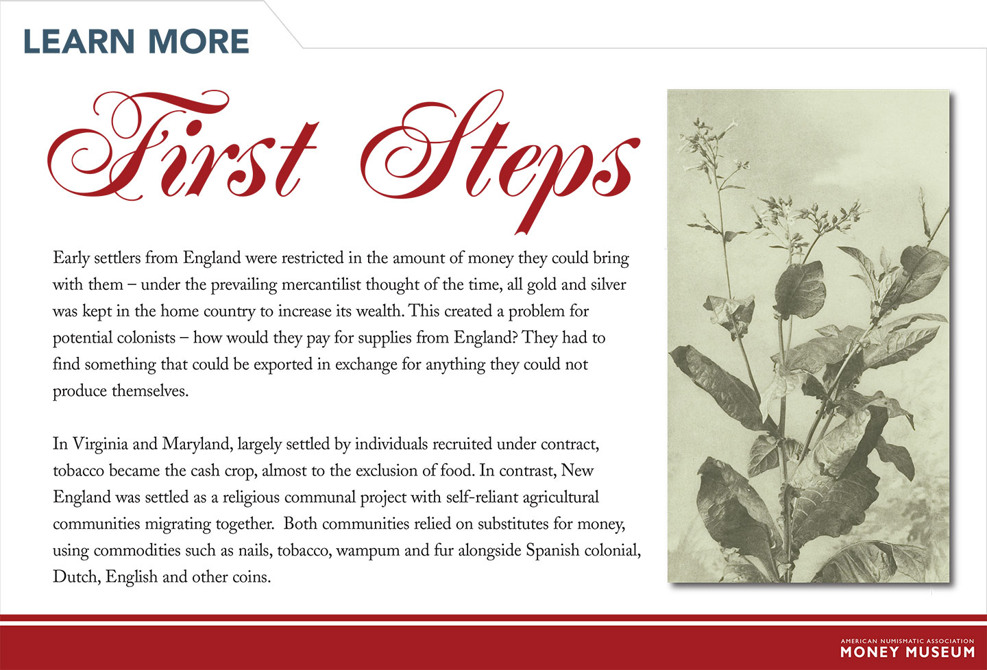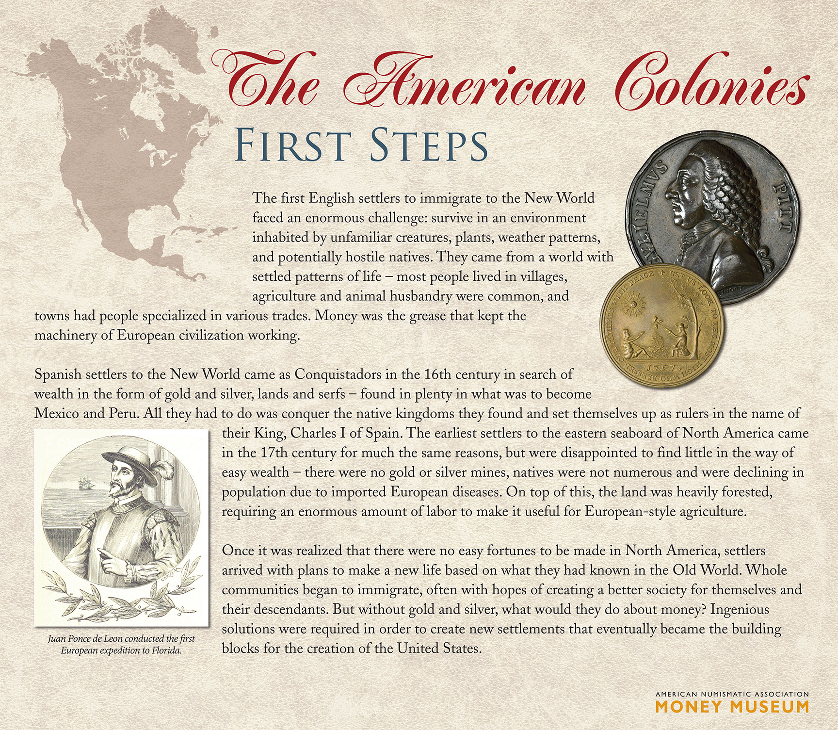 Once it was realized that there were no easy fortunes to be made in North America, settlers arrived with plans to make a new life based on what they had known in the Old World. Whole communities began to immigrate, often with hopes of creating a better society for themselves and their descendants. But without gold and silver, what would they do about money? Ingenious solutions were required in order to create new settlements that eventually became the building blocks for the creation of the United States.