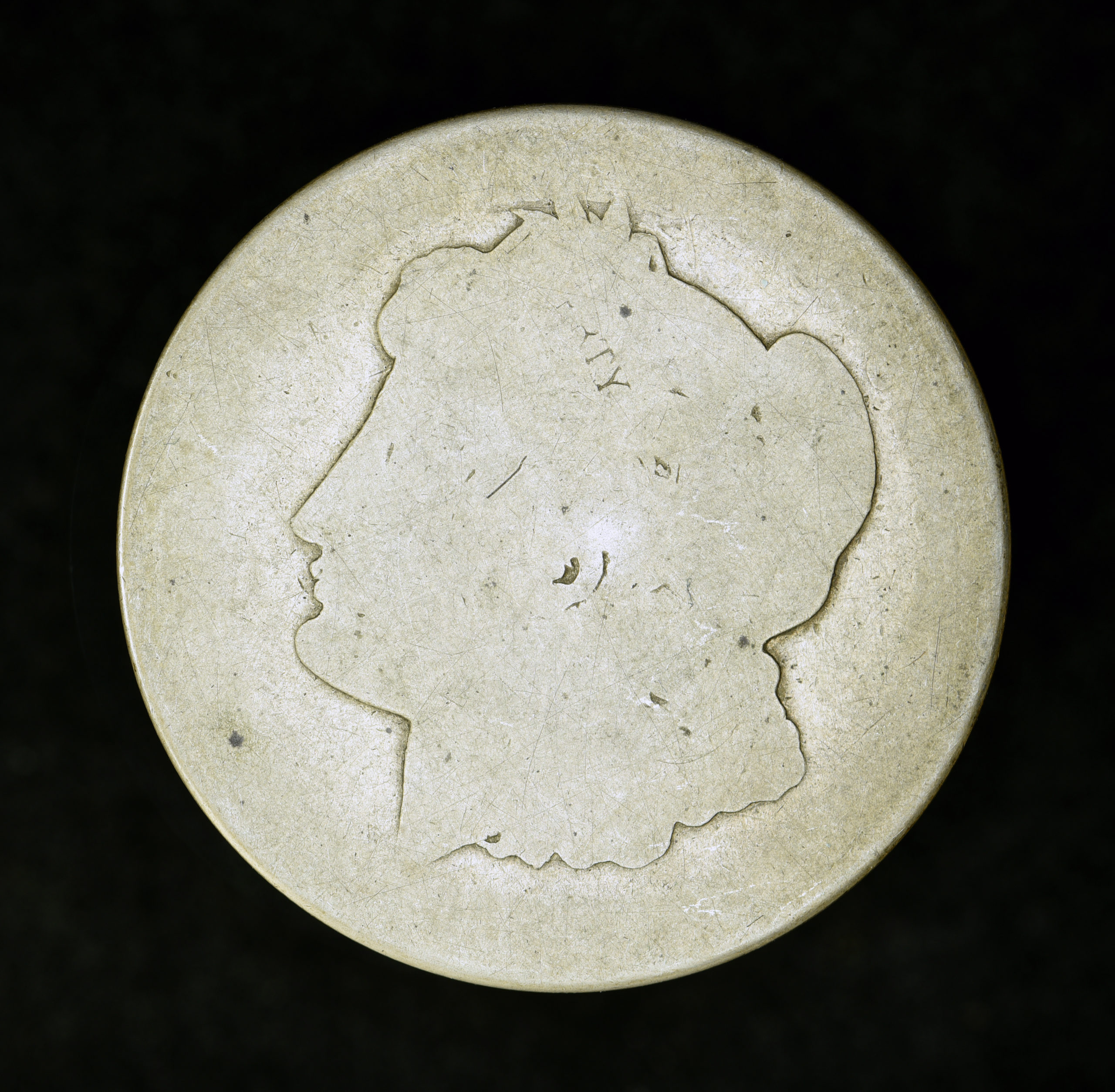 Obverse: Head is outlined with nearly all details worn away. Date is readable but worn. Legend merges into rim.