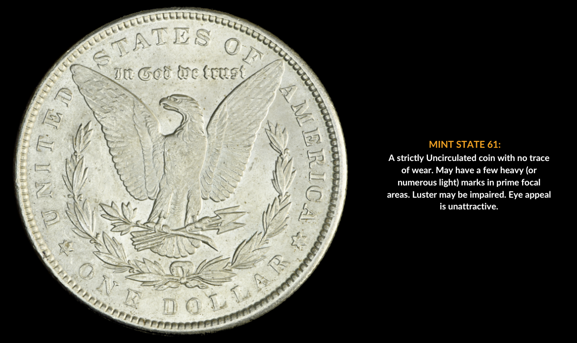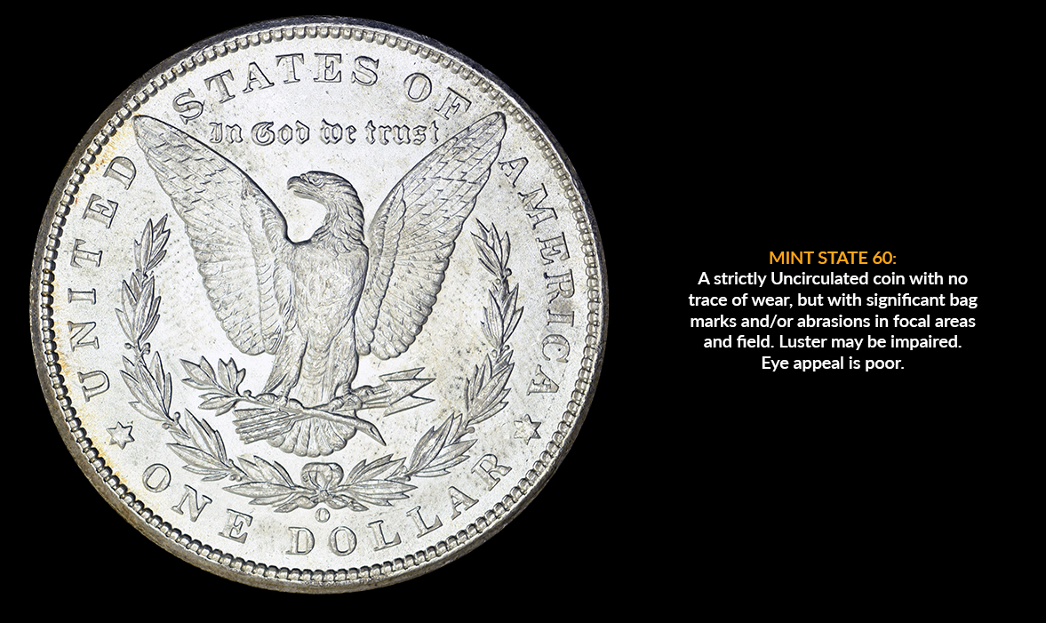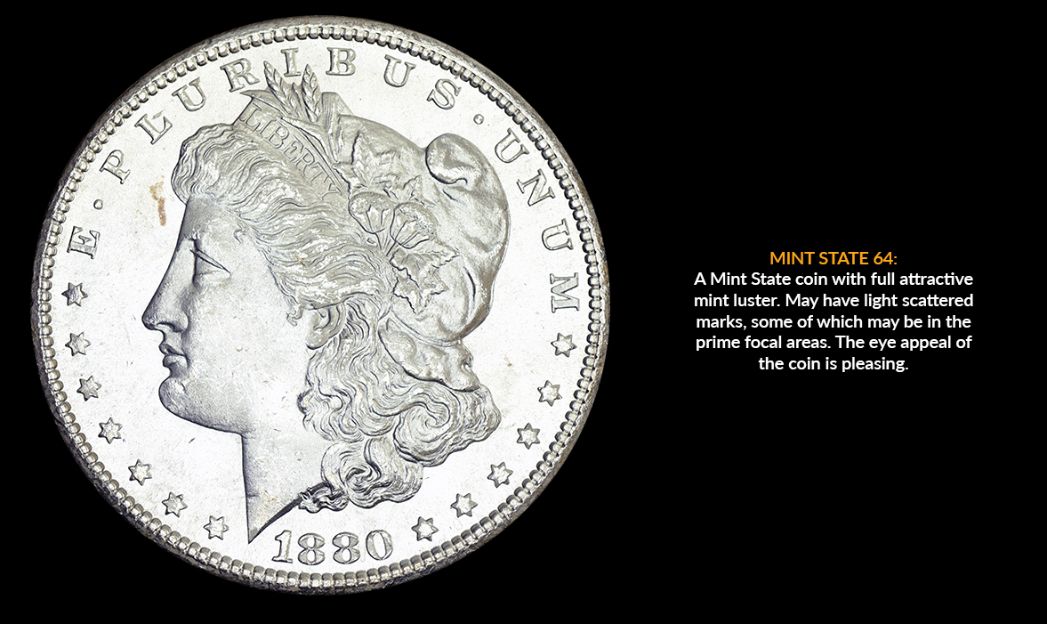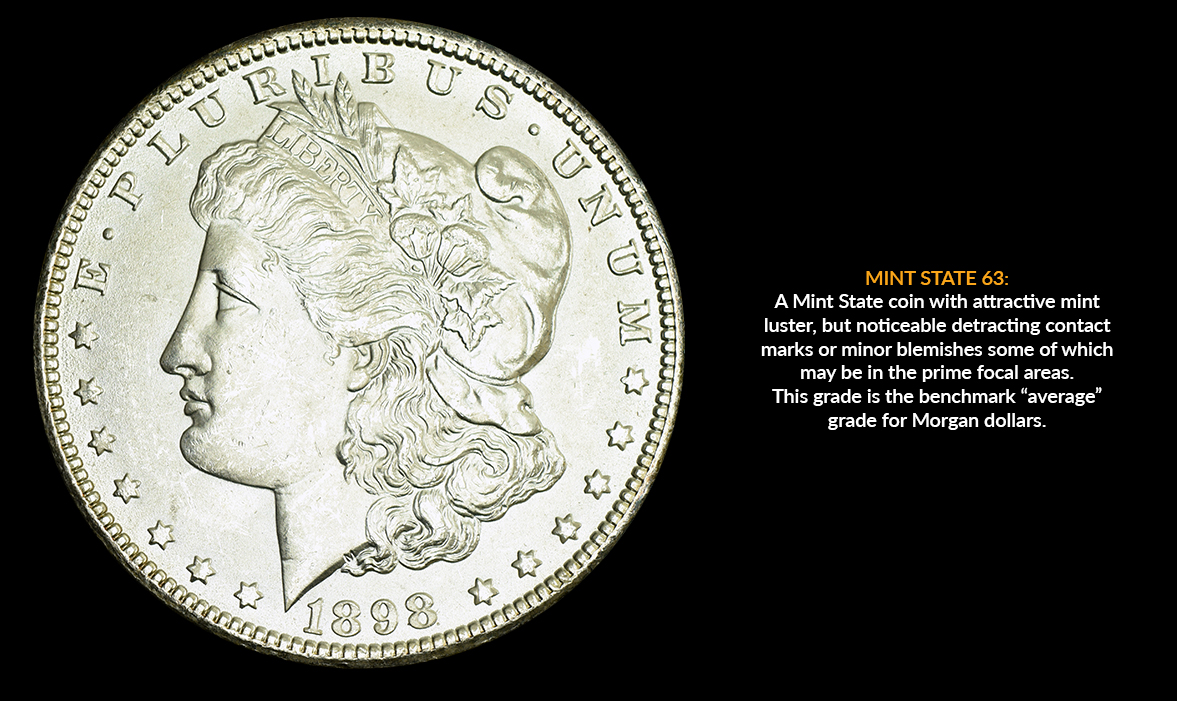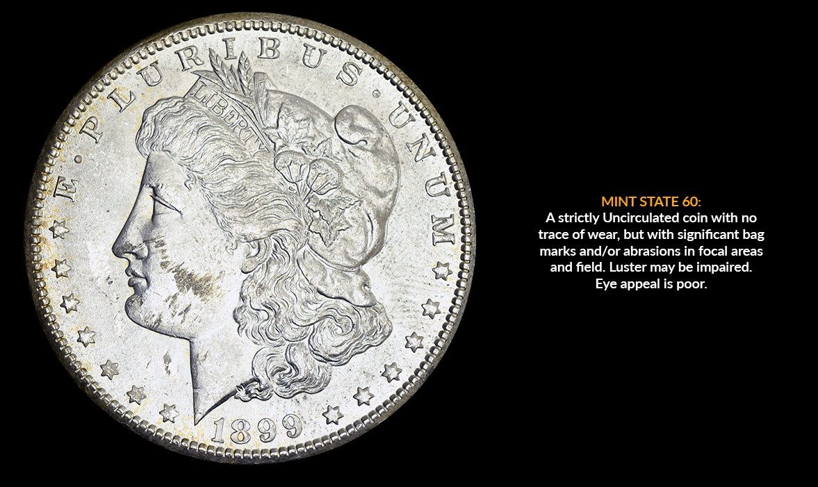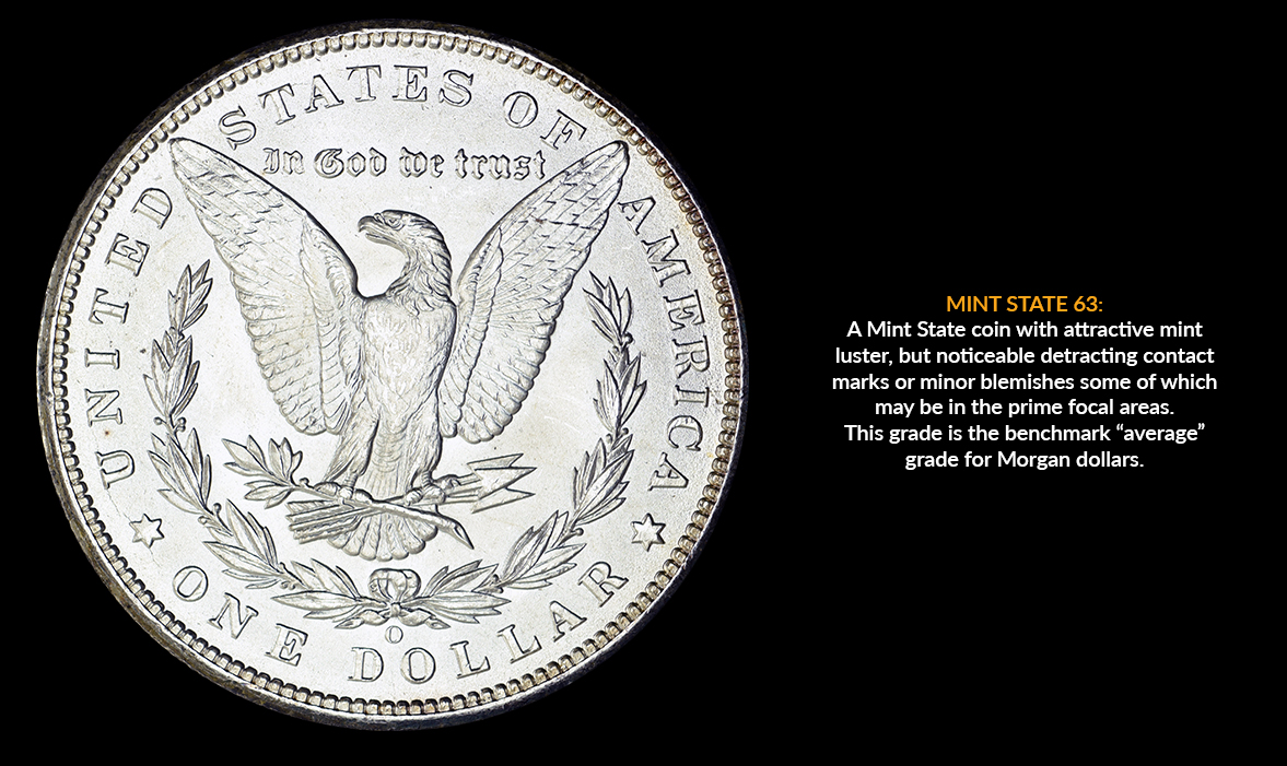 A Mint State coin with attractive mint luster, but noticeable detracting contact marks or minor blemishes; some of which may be in prime focal areas. This grade is the benchmark “average” grade for Morgan dollars.
