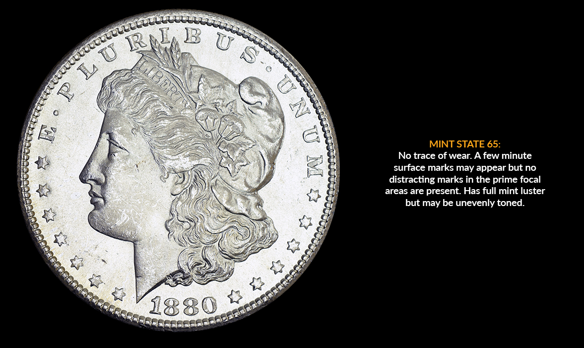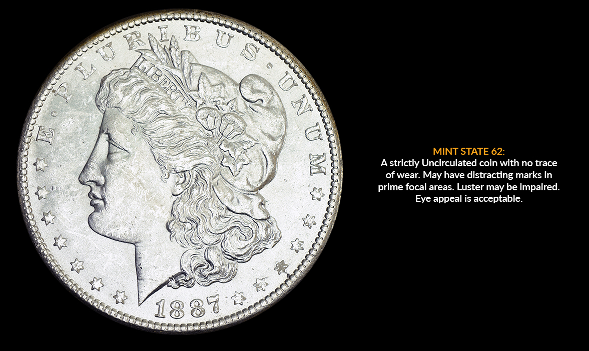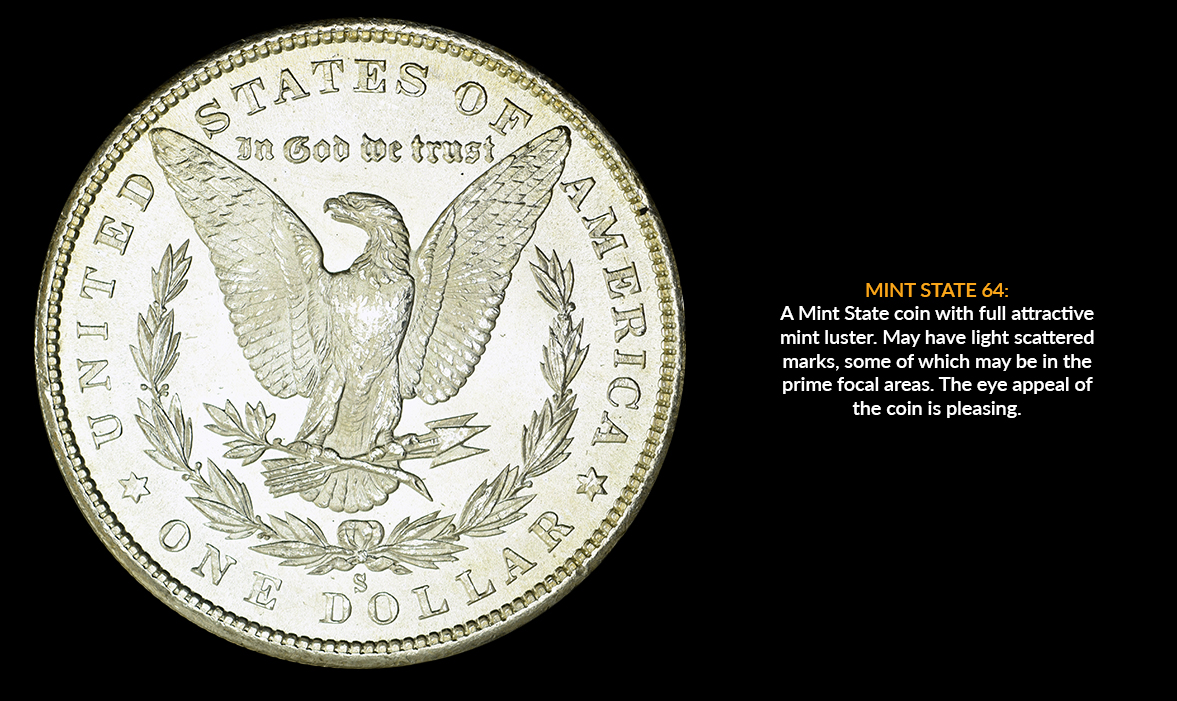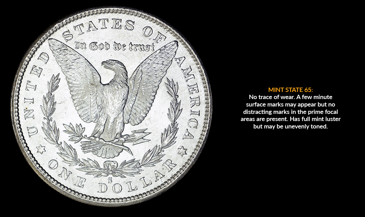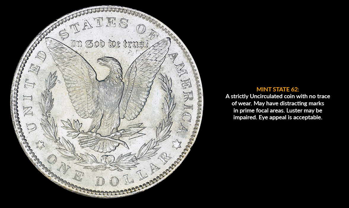 A Mint State coin with attractive mint luster, but noticeable detracting contact marks or minor blemishes; some of which may be in prime focal areas. This grade is the benchmark “average” grade for Morgan dollars.