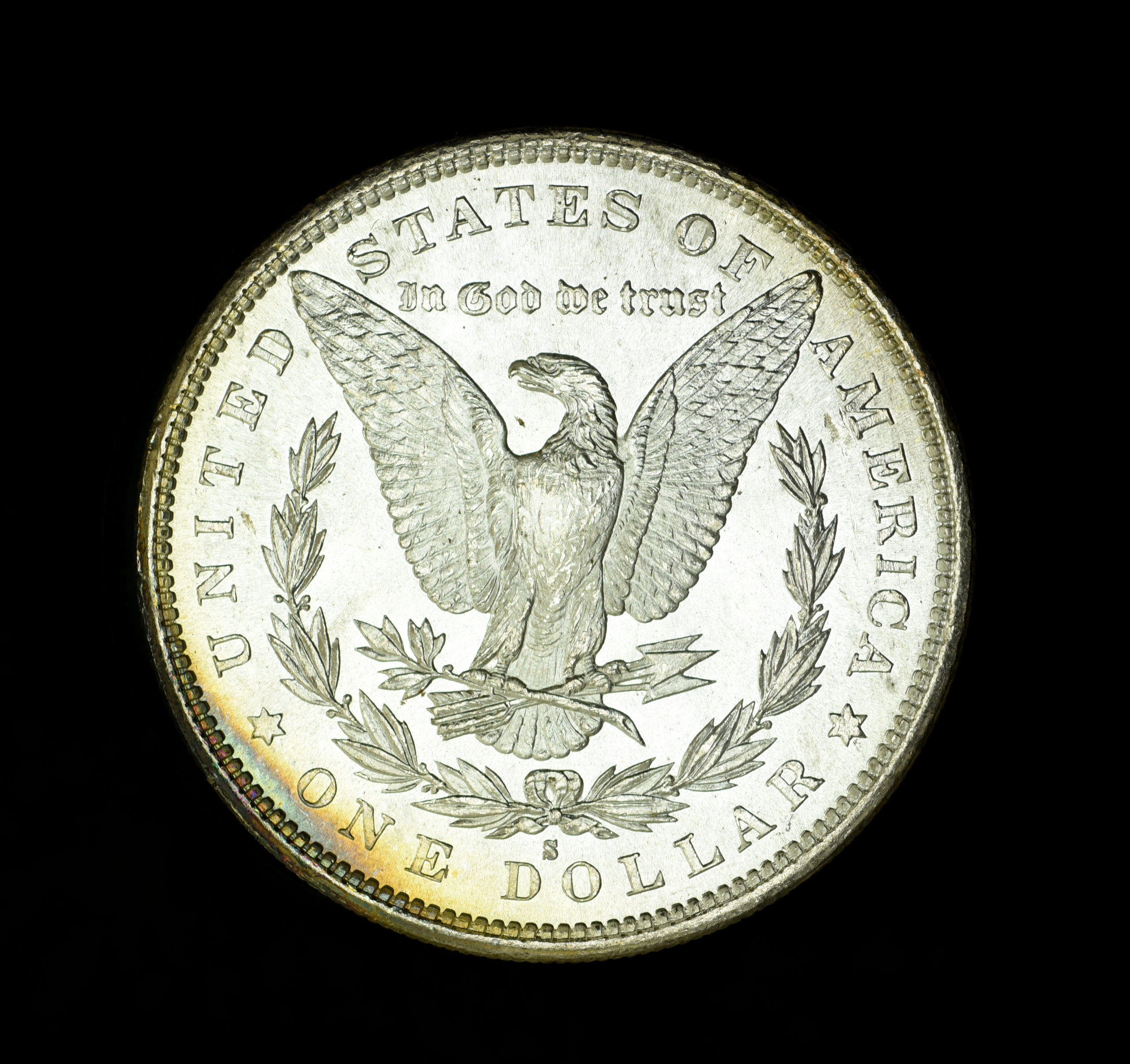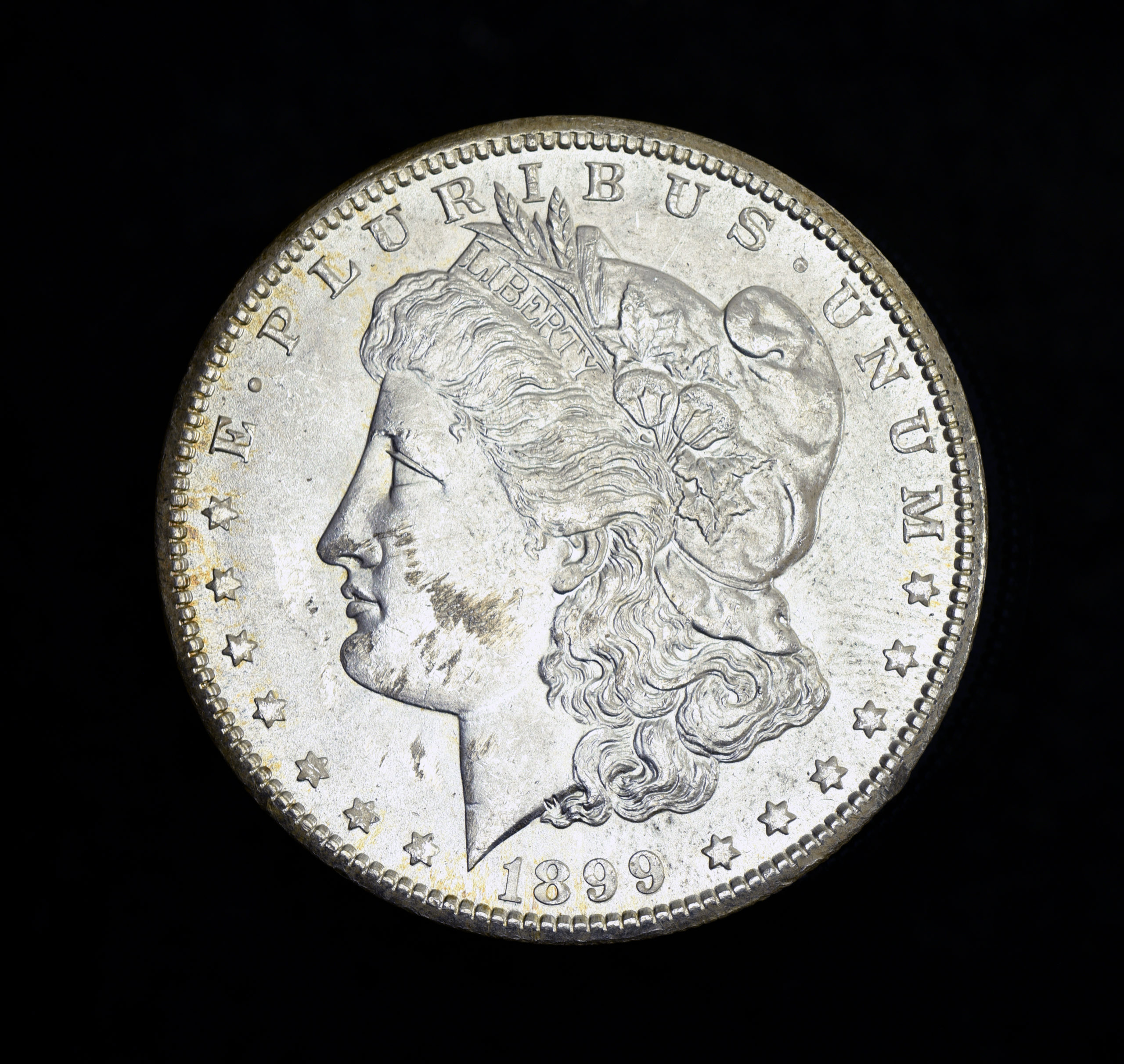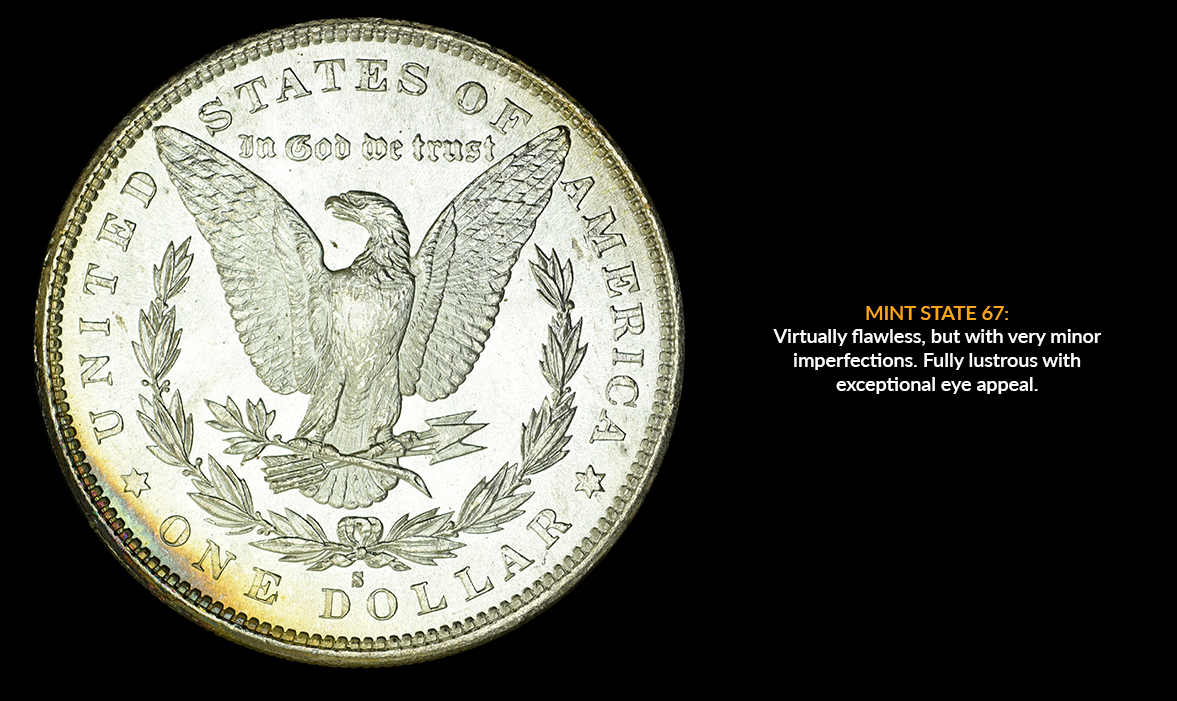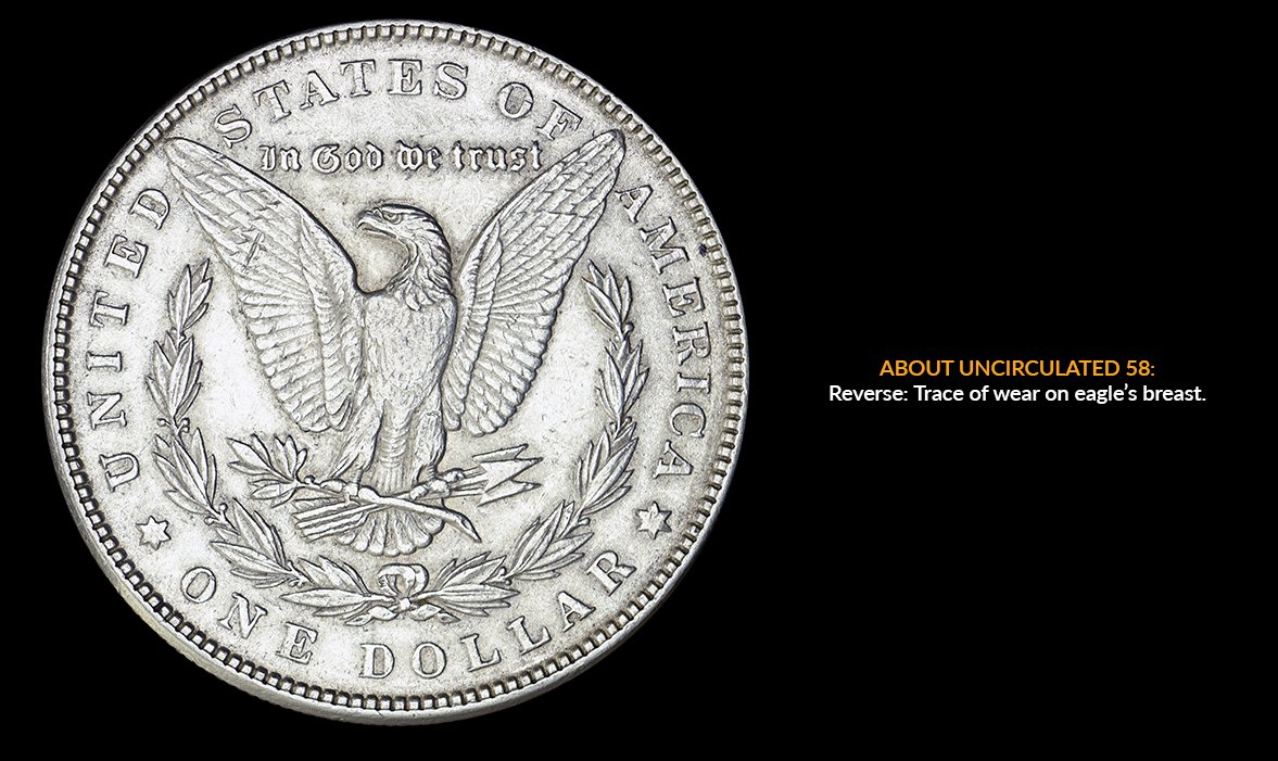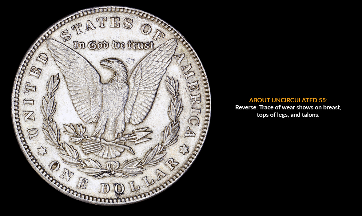 A Mint State coin with attractive mint luster, but noticeable detracting contact marks or minor blemishes; some of which may be in prime focal areas. This grade is the benchmark “average” grade for Morgan dollars.