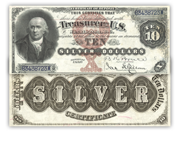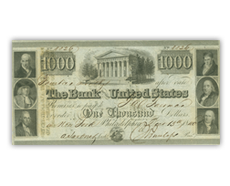 Robert Morris influenced numismatics in other ways as well. His portrait was featured on the first $1,000 Legal Tender notes in 1862-63, $10 silver certificates in 1878-80, and various medals and obsolete notes. Along with fellow war financier Oliver Pollack, Morris is credited with the first use of the dollar symbol in official government correspondence. Used by private merchants much earlier, the “$” was likely modeled after the pillar and flowing ribbon found on the Spanish dollar.