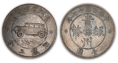 The updated and final motif depicts Zhou’s car (or a slight variation) with a Chinese legend reading “Made by the Kweichow Government” above and the denomination “Seven Mace and Two Candareens” (1 yuan, the base unit of Chinese money) below. The reverse features a poppy with the legend “Kweichow Silver Coin,” “Seventeenth Year of the Republic of China” (1928) and “One Yuan.” For many years, it was the first and only coin to feature an automobile as a main device.