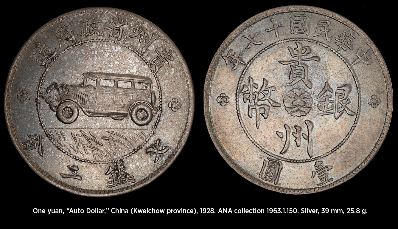Each of the objects in the ANA’s Edward C. Rochette Money Museum collection has a unique story. One intriguing tale involves the 1928 “Auto Dollar.” This rare and historic piece was produced at a chaotic time in China’s history, and holds the distinction of being the first coin to feature an automobile as a main device.
