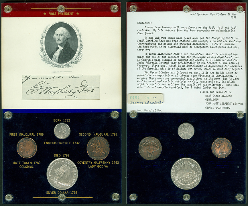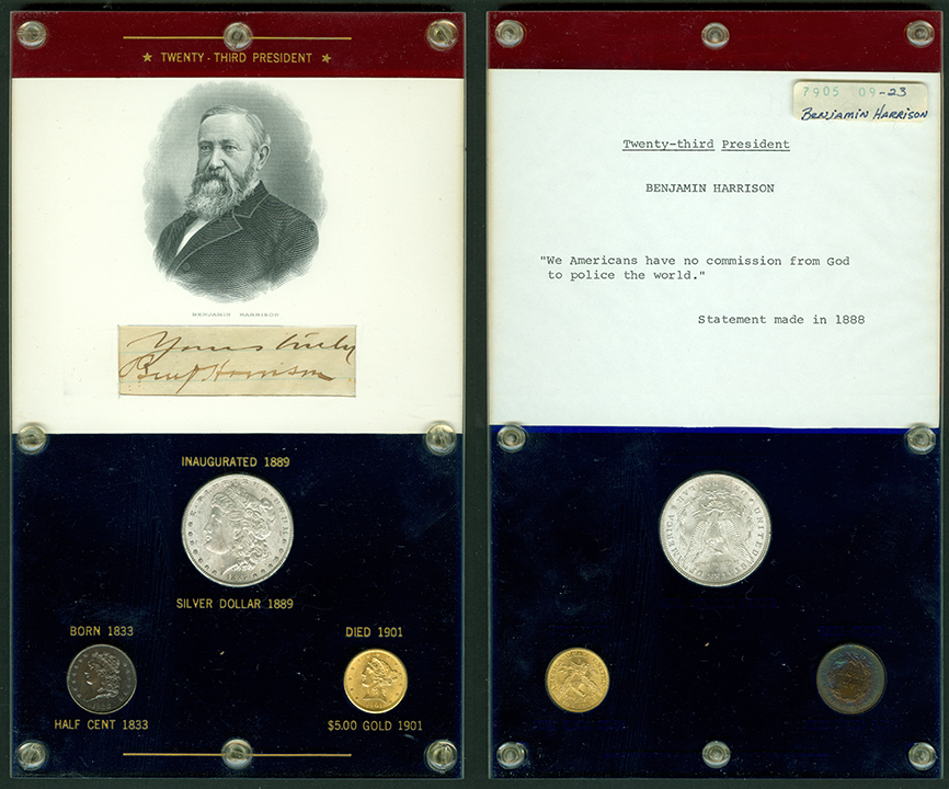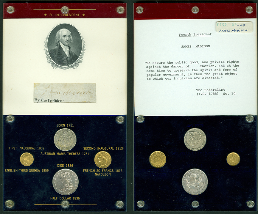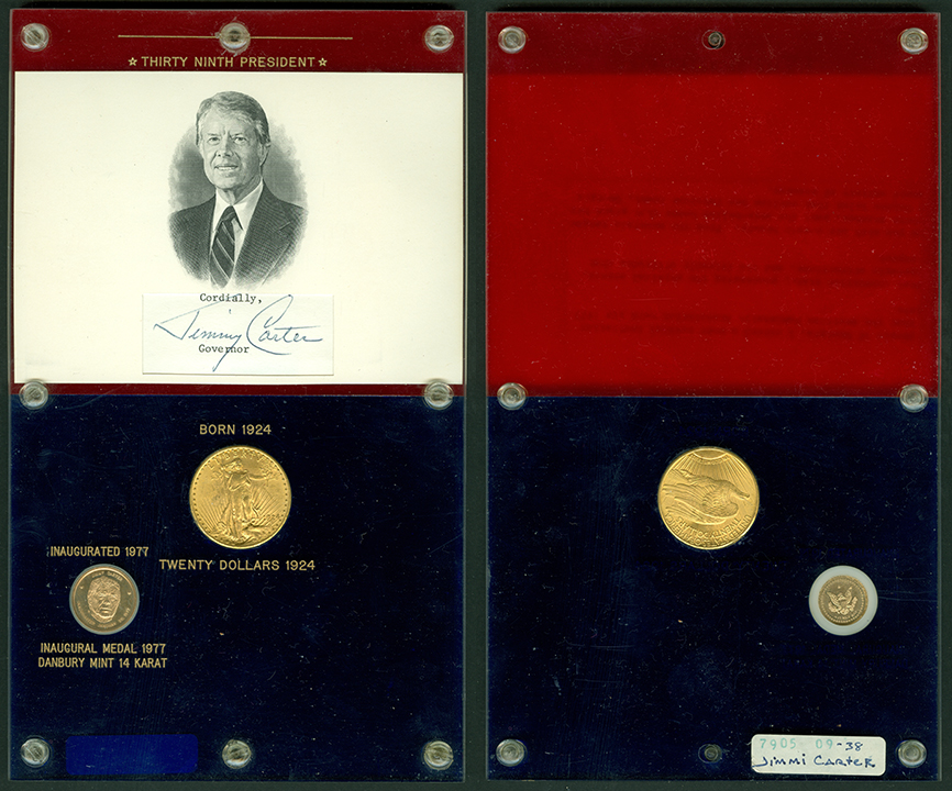 In 1979, the Money Museum received an incredible donation combining numismatic and presidential history. The Elliott Markoff Collection consists of 38 custom-made Capital Plastics holders featuring every U.S. President from George Washington to Jimmy Carter. Each holder includes:
