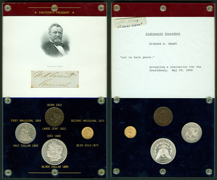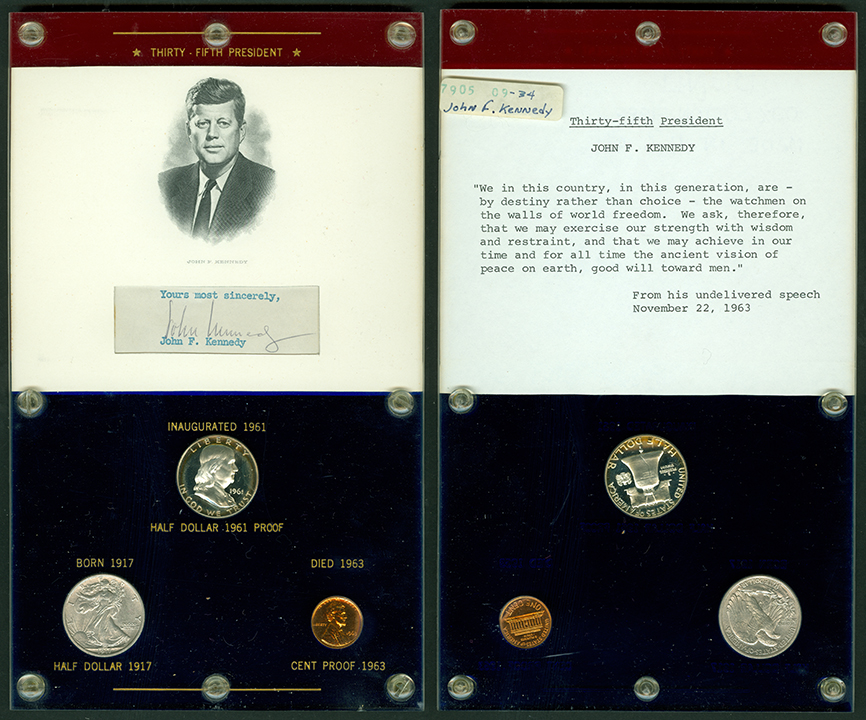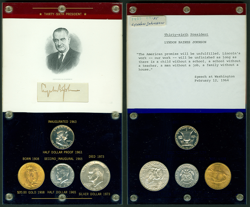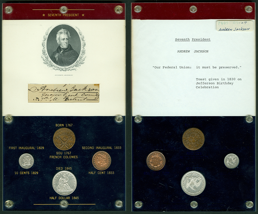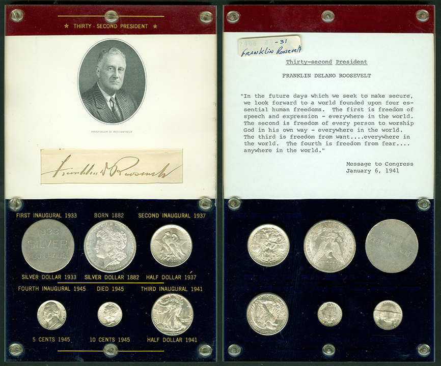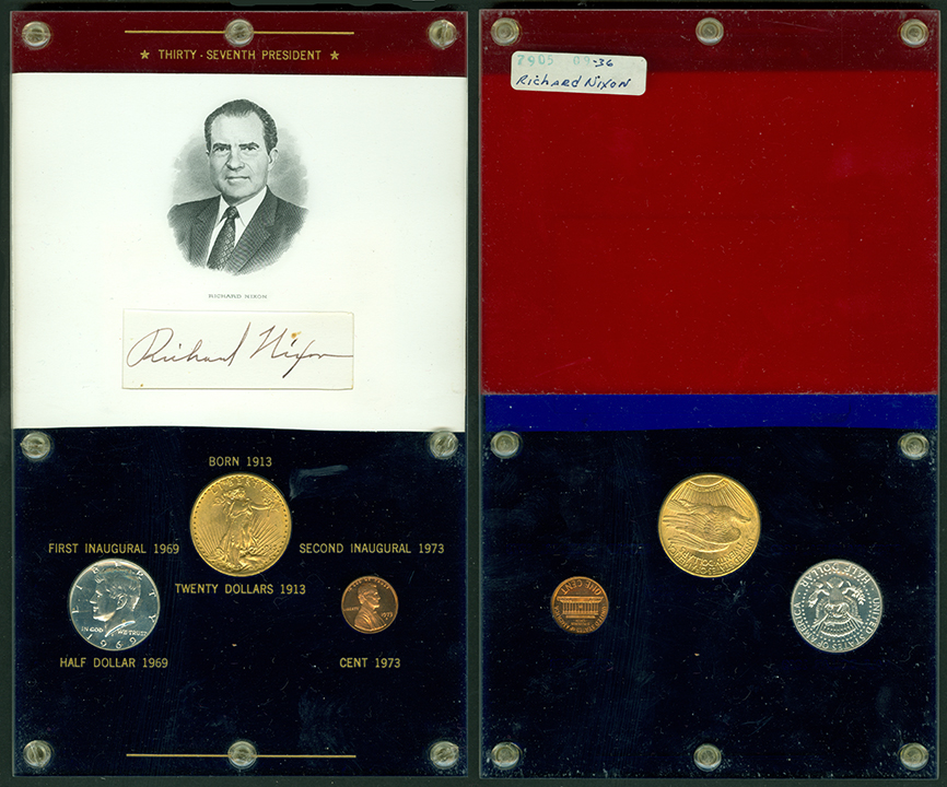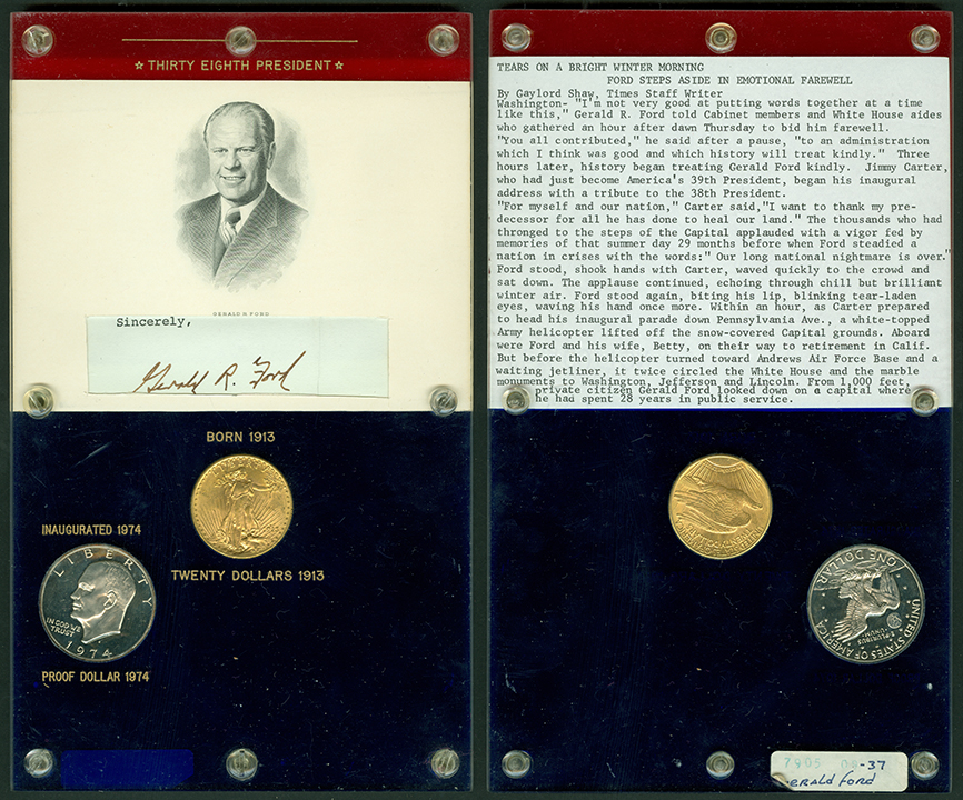 Elliott Markoff was a prominent California collector who immigrated to the United States from Poland when he was 21. He assembled his presidential collection over a 15-year period, and won awards displaying it competitively at coin conventions. At the time of its donation, only Richard Nixon, Gerald Ford and Jimmy Carter’s holders were not complete. Unfortunately, Markoff died in 1982, just as he was putting together material honoring Ronald Reagan.