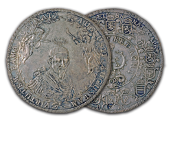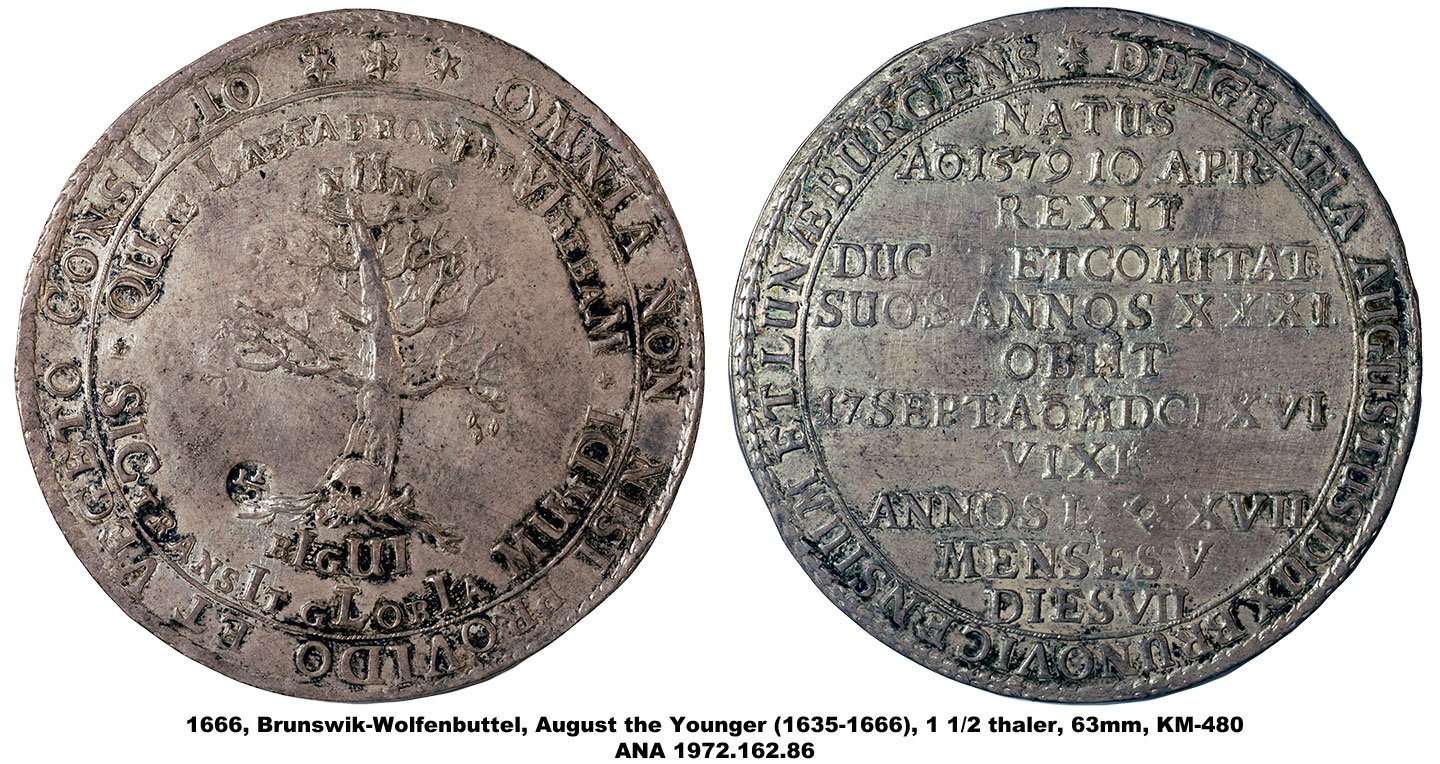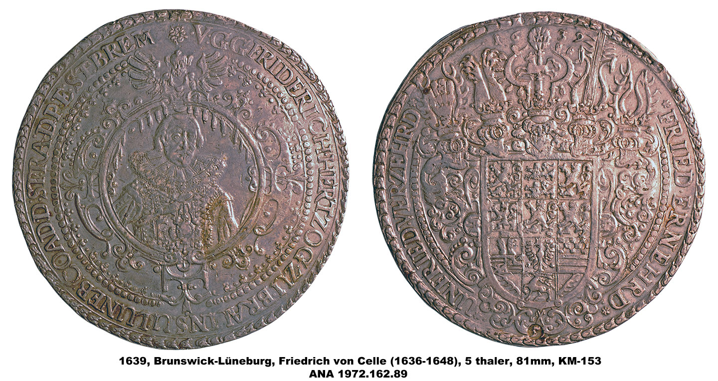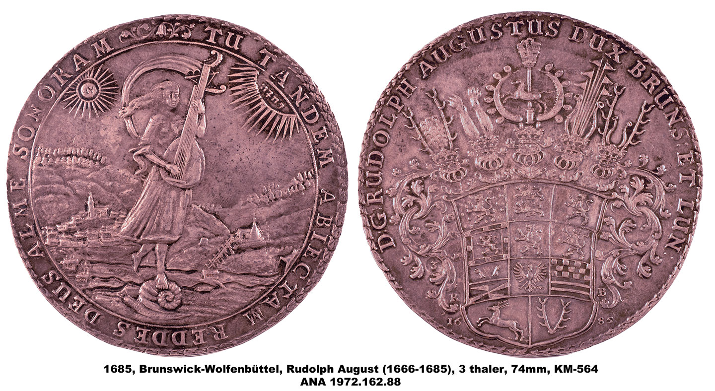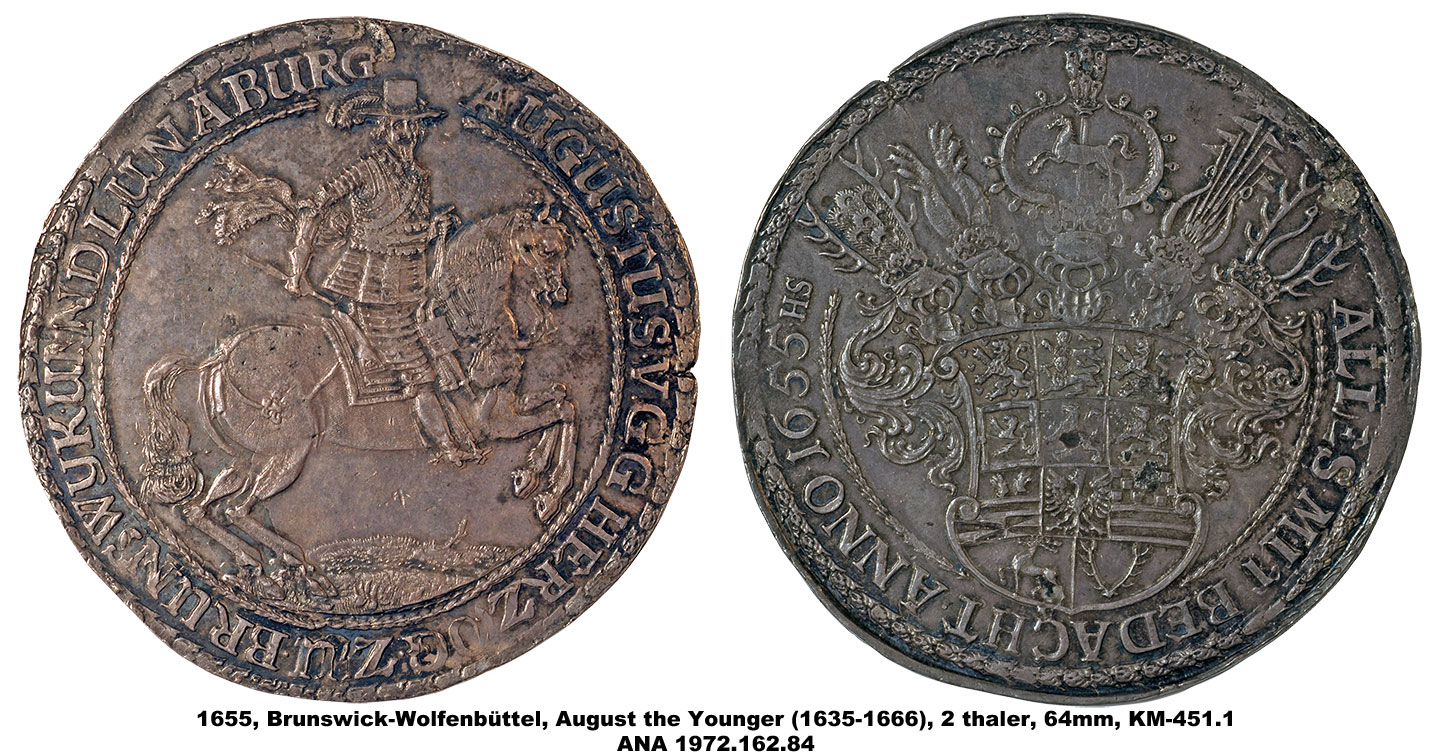The ANA’s multiple thalers range in denomination from 1 ½ to 5 thalers and include pieces dating from 1608 to 1680. They vary in diameter from 63mm to 81mm, making them among the largest of the coins in the Money Museum. The designs include portraits, allegorical scenes and views of the mines and countryside of Brunswick as well as elaborate coats-of-arms. The subject of the pieces is also varied and includes two medals memorializing the death of Duke August the Younger, and others with more general themes celebrating the productivity of the mines.