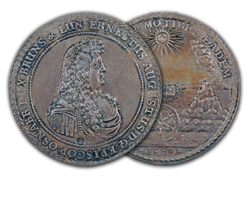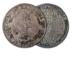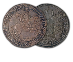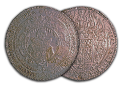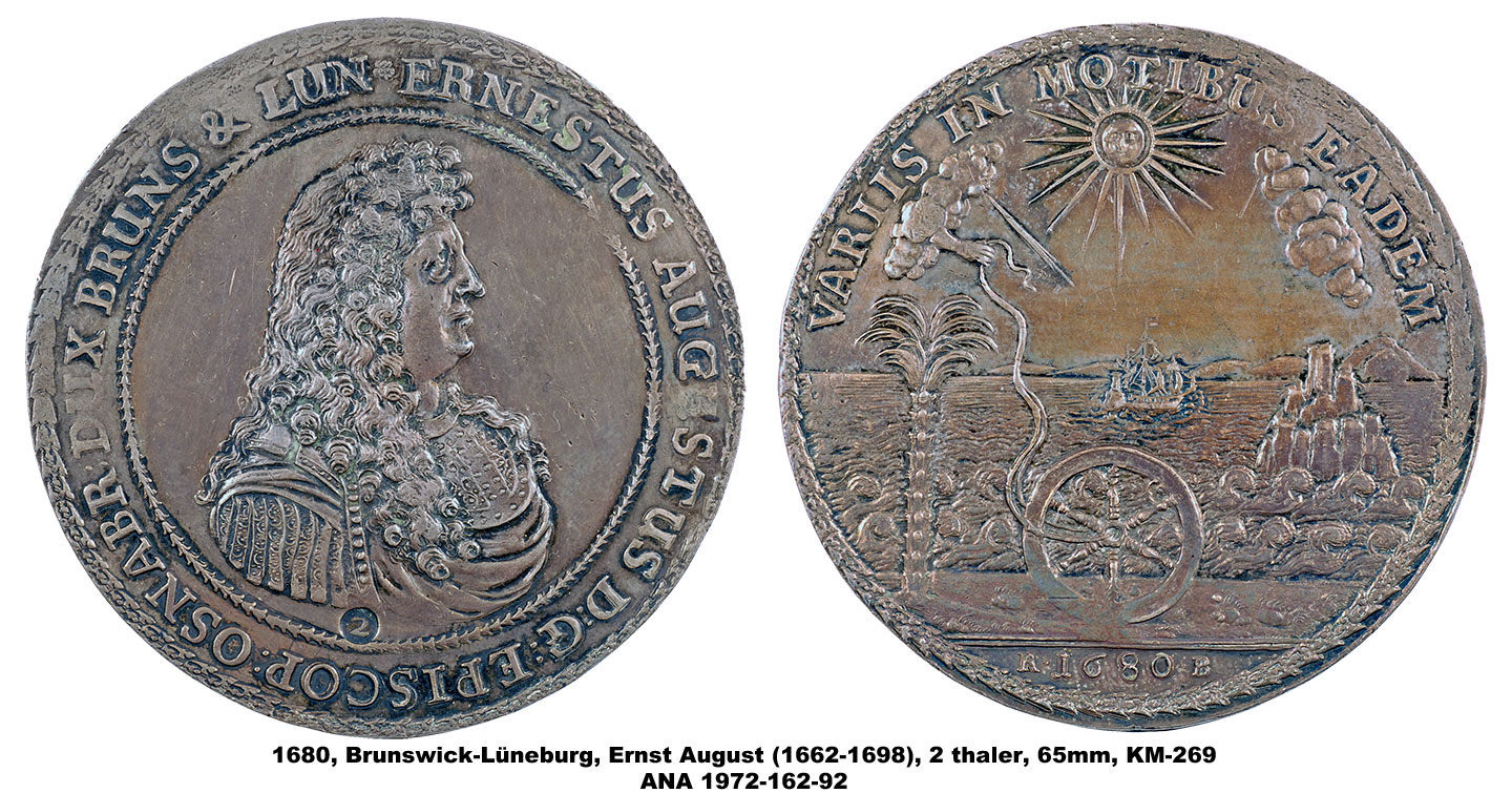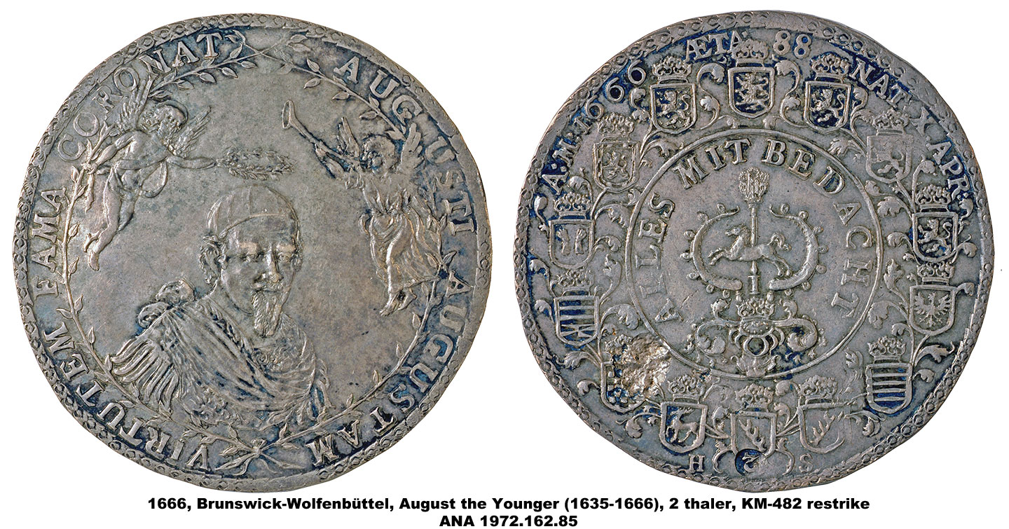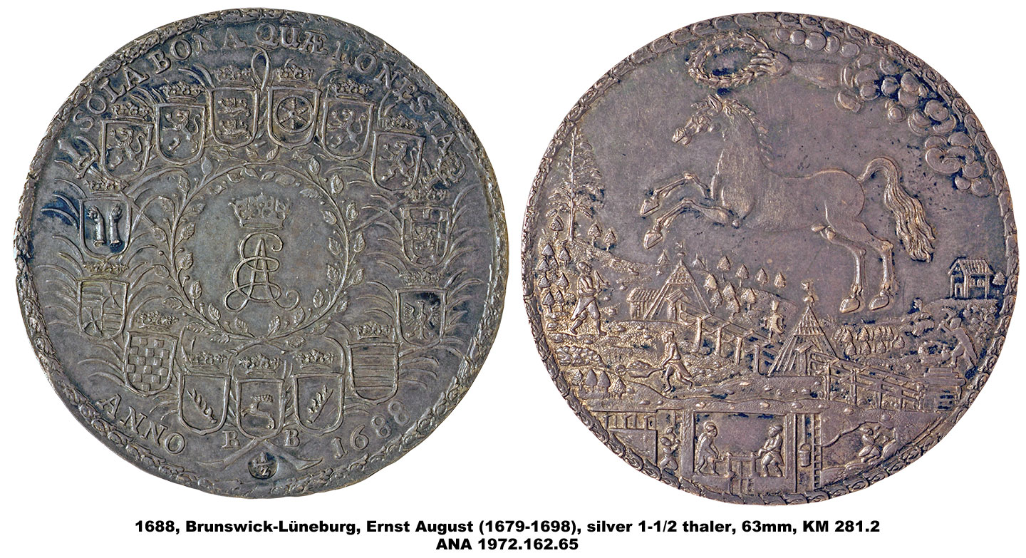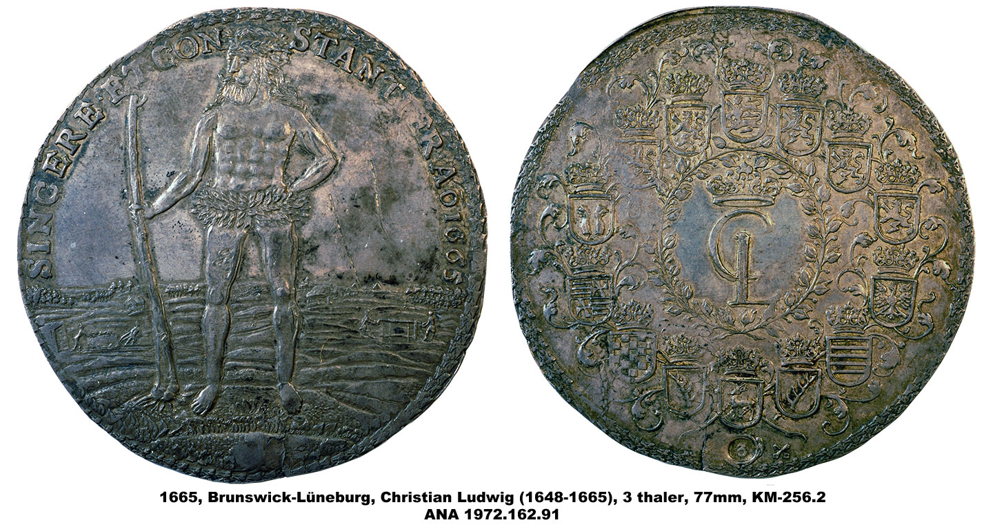 The ANA’s multiple thalers range in denomination from 1 ½ to 5 thalers and include pieces dating from 1608 to 1680. They vary in diameter from 63mm to 81mm, making them among the largest of the coins in the Money Museum. The designs include portraits, allegorical scenes and views of the mines and countryside of Brunswick as well as elaborate coats-of-arms. The subject of the pieces is also varied and includes two medals memorializing the death of Duke August the Younger, and others with more general themes celebrating the productivity of the mines.