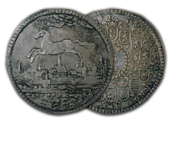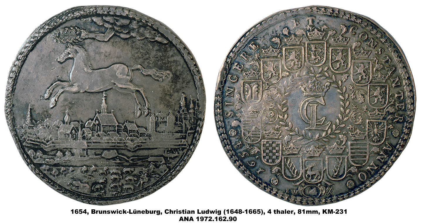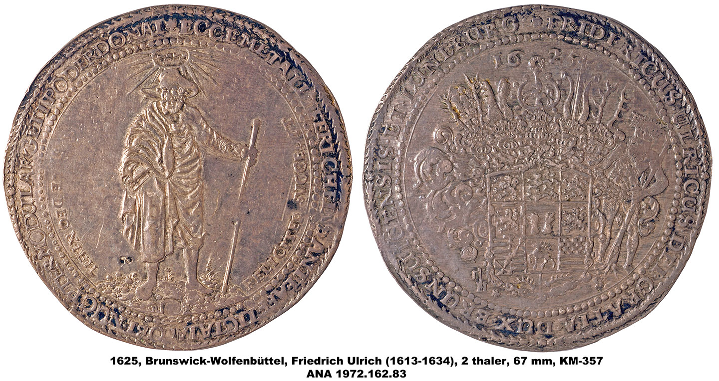 Thalers are silver coins minted in the Holy Roman Empire and Prussia from the 16th to 19th centuries. Their name was taken from Joachimsthaler; the first thalers were produced in the town of Joachimsthal. Our current word “dollar” is derived from “thaler.” Some of the largest of these coins are the “multiple thalers” issued beginning in 1574 by Duke and Prince Julius of Brunswick-Lüneburg and Brunswick-Wolfenbüttel. These large pieces, known as “juliusloeser” (Julius Redeemers) or “loeser,” have been popular among collectors since the 18th century. Their large size allowed for the creation of beautiful portraits and designs in a wide variety of subjects. The ANA is fortunate to have a collection of these fascinating pieces.