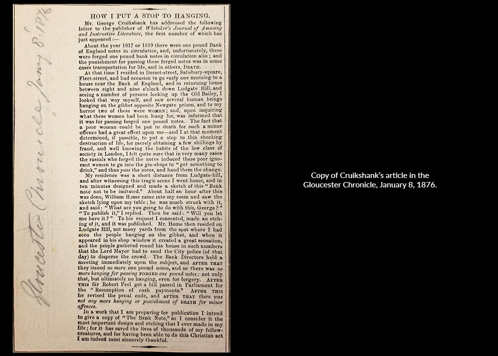 Cruikshank’s act of social activism helped galvanize public opinion and bring about change. In the final paragraph of his 1876 article in the Gloucester Chronicle, he writes: