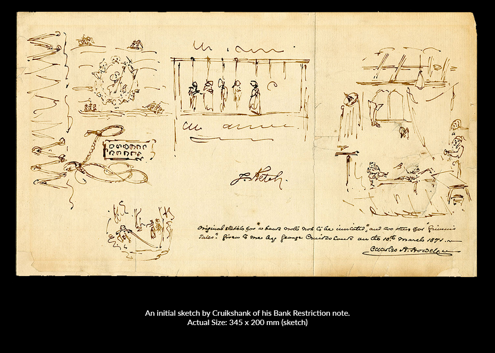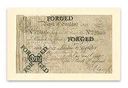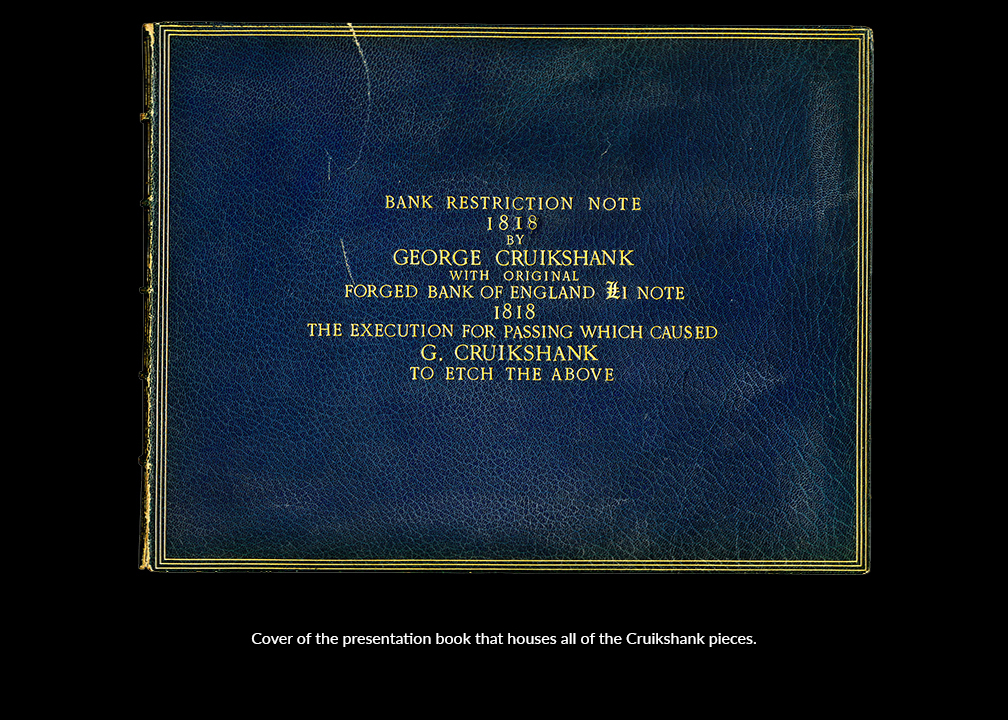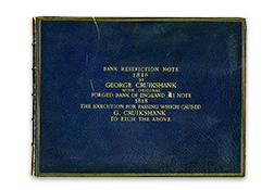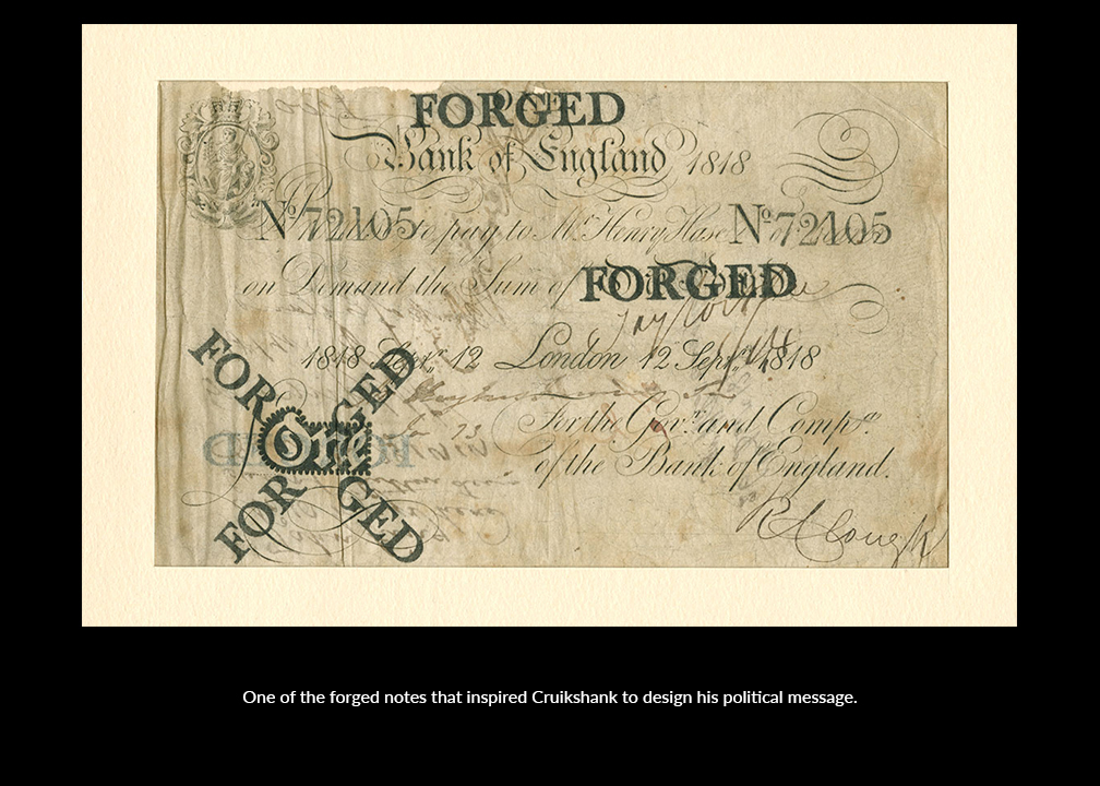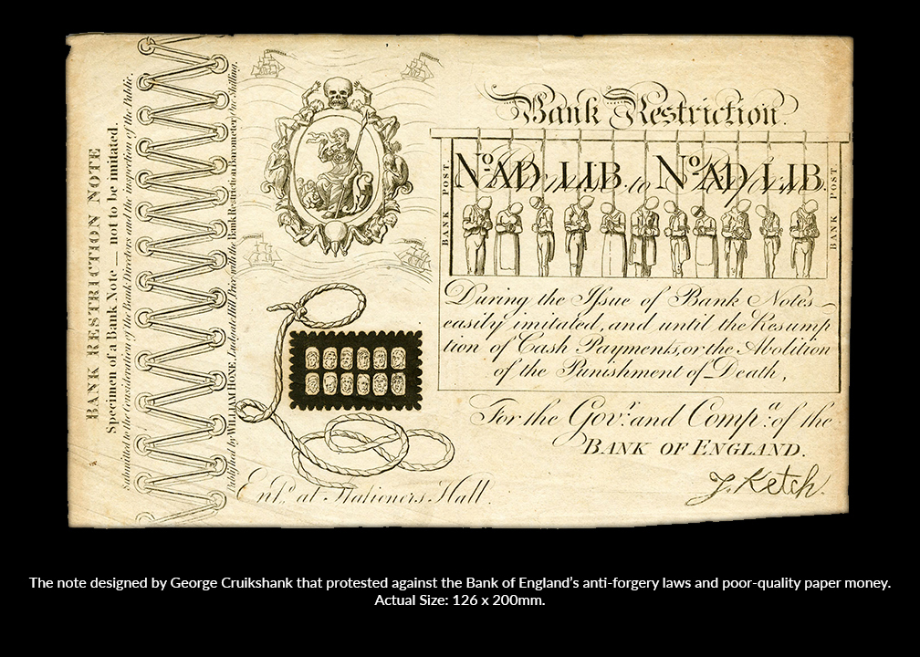 The Bank of England refused to improve the quality of its notes or change its punishments for forgeries. This incited public outrage, often expressed through caustic cartoons and pamphlets. In 1818 caricaturist and satirist George Cruikshank (1792-1878) designed a famous protest in the form of a satirical bank note that lampooned the Bank of England’s currency. Specimens were published by influential political satirist William Hone (1780-1842), and distributed to the Bank of England’s directors and the public.