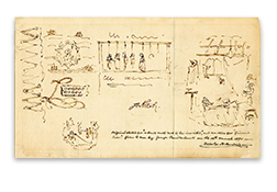 The Edward C. Rochette Money Museum owns several objects related to this story, including a specimen of the Cruikshank note, a forged note that inspired his creation, his original sketch for the piece, and a copy of an article he wrote in 1876 about his role in ending the injustice. The device at left simulates a ledger binding. The upper left shows a cartouche with a caricature of Britannia eating her children, surrounded by ships labeled “Transport” (the contemporary term for exiling convicted criminals to places like Australia). A noose, tormented faces and a skull also appear.