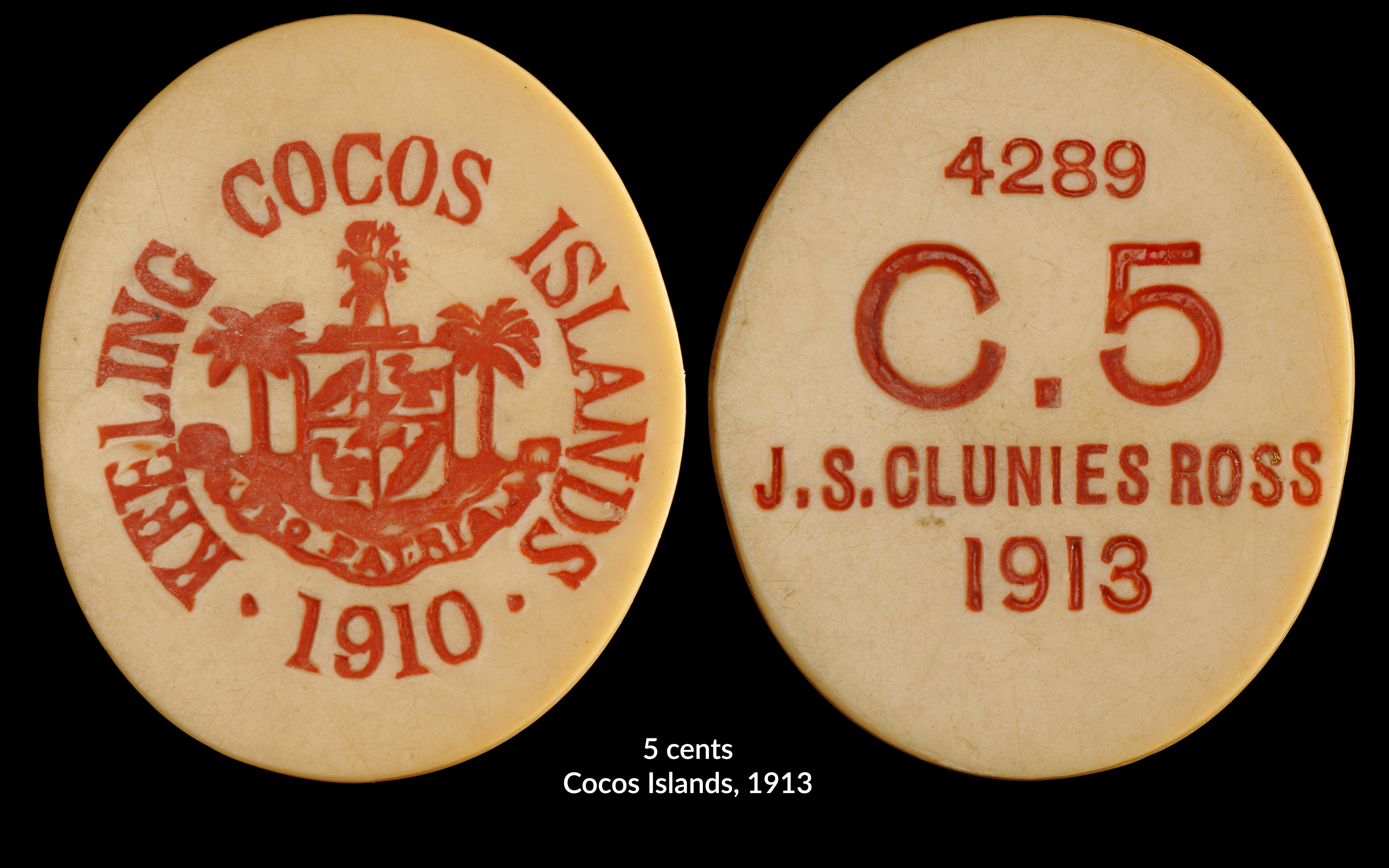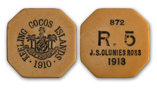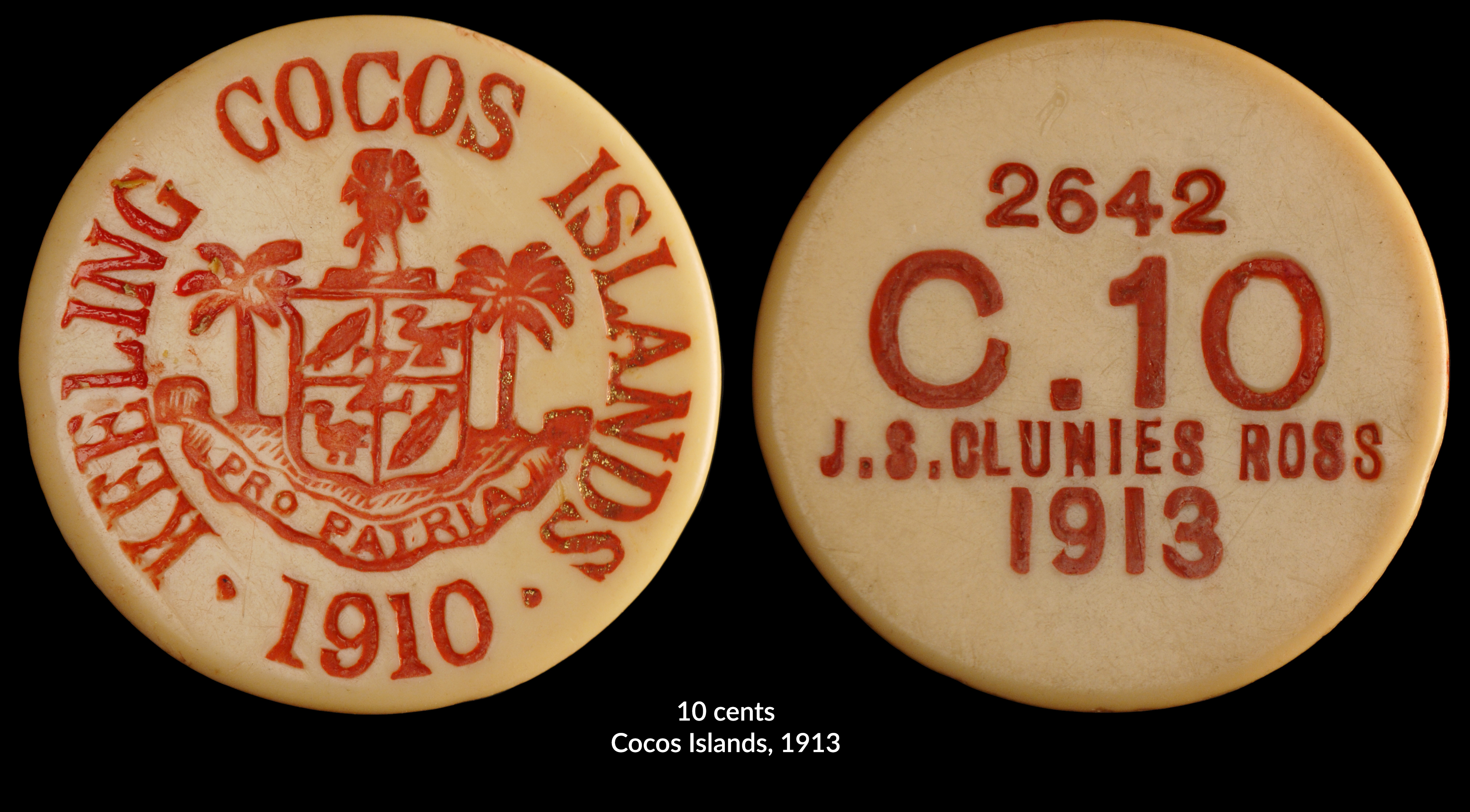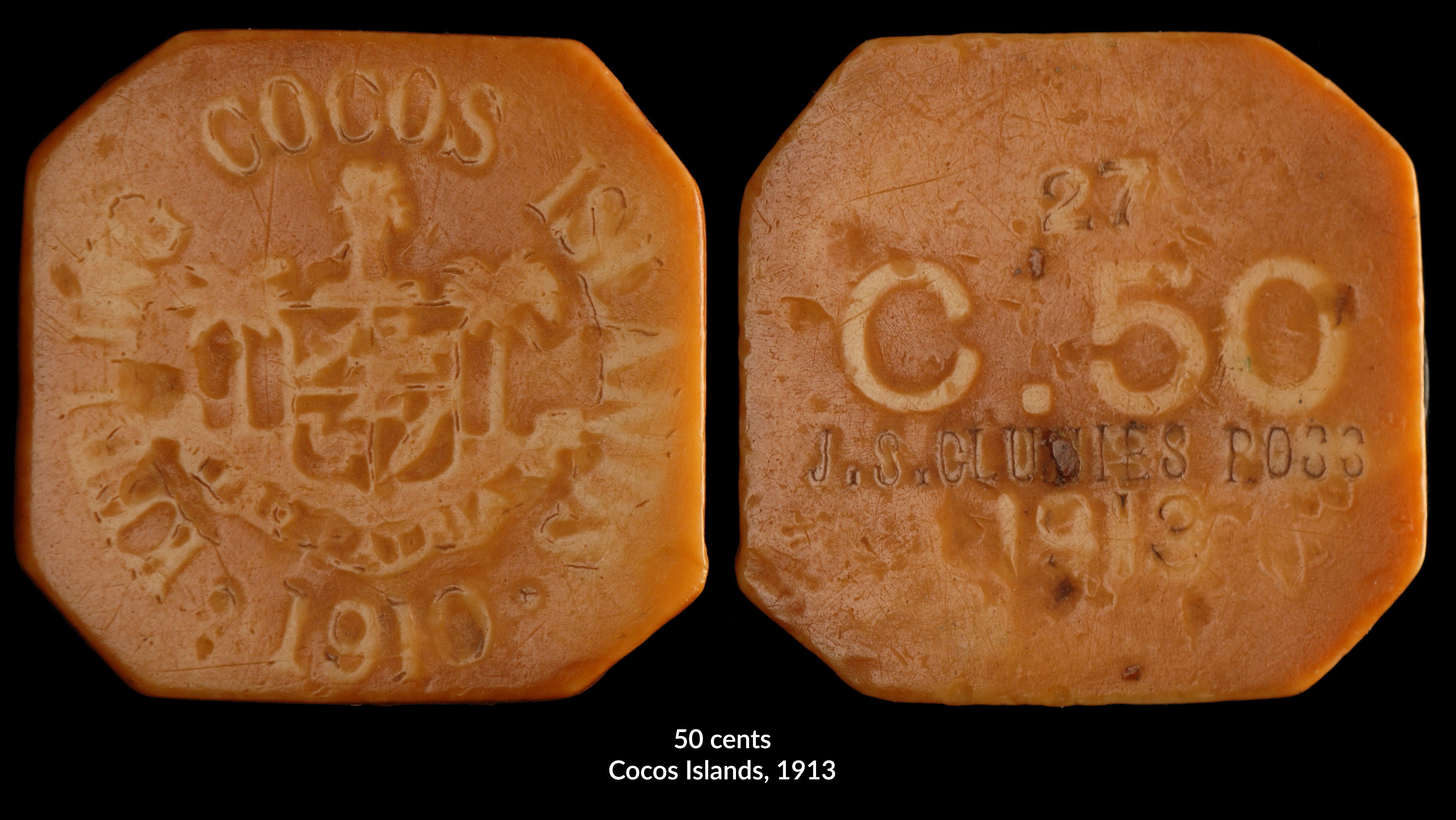 The tokens were a variety of shapes including circles, ovals, squares and octagons. These unusual shapes and material served a purpose: Ross IV followed in his great-grandfather’s footsteps to create a closed economic system which prevented the islanders who worked at his plantation and store from buying firearms, alcohol or other goods from passing ships. The tokens continued in circulation until 1955, when the Cocos Islands became an Australian territory.